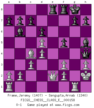 Last move : 0-1 2013 January 22 18:21:47 [Event "FICGS__CHESS__CLASS_E__000158"] [Site "FICGS"] [Date "2013.01.07"] [Round "1"] [White "Frame,Jeremy"] [Black "Sengupta,Arnab"] [Result "0-1"] [WhiteElo "1407"] [BlackElo "1340"] 1.e4 e5 2.Nf3 Nf6 3.Nc3 Nc6 4.Bc4 Bc5 5.O-O d6 6.d3 Bg4 7.h3 Bh5 8.Be3 O-O 9.Nd5 Nxd5 10.exd5 Nd4 11.Bxd4 Bxd4 12.c3 Bb6 13.Qe2 f5 14.d4 e4 15.Kh2 exf3 16.gxf3 Qh4 17.Rg1 Rae8 0-1 Petrov Three knights game Kingside Castling by player White (move 5) Kingside Castling by player Black (move 8) Player Black won this chess game. Follow this game move after move (download)You have to have the fighting spirit. You have to force moves and take chances. (Bobby Fischer) Die unerbitterlichsten Regeln im Schach sind die Ausnahmen. (Savielly Grigorievitsch Tartakower) La maestría del Ajedrez consiste esencialmente en analizar posiciónes de Ajedrez con precisión. (Mikhail Botvinnik) Dans le domaine de la peinture, de la gravure et de la sculpture, dès la première décennie de notre siècle, les artistes abandonnent la représentation de la partie d'échecs pour se concentrer sur les pièces, sur les échiquiers et sur toutes les variations auxquelles les unes et les autres peuvent donner lieu. On passe en quelque sorte d'un thème social à un thème musical (au sens de la musica médiévale, c'est-à-dire d'une notion qui inclue le rythme, l'harmonie, la construction et la déconstruction, etc.). Graphiquement et picturalement, l'échiquier apparaît comme une structure ouverte, dynamique, d'une richesse infinie, autorisant toutes les combinatoires et débouchant sur des mouvements et des rythmes de nature exponentielle. (Michel Pastoureau) Experience is the name we all give to our mistakes. (Oscar Wilde)