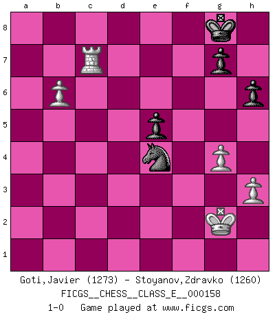 Last move : 1-0 2013 February 26 21:31:45 [Event "FICGS__CHESS__CLASS_E__000158"] [Site "FICGS"] [Date "2013.01.07"] [Round "1"] [White "Goti,Javier"] [Black "Stoyanov,Zdravko"] [Result "1-0"] [WhiteElo "1273"] [BlackElo "1260"] 1.c4 c5 2.Nc3 Nc6 3.g3 e6 4.Bg2 Ne5 5.b3 Ng4 6.Nf3 d6 7.O-O Be7 8.Bb2 N8f6 9.h3 Nh6 10.a3 O-O 11.b4 cxb4 12.axb4 e5 13.e4 Be6 14.Ng5 Bxc4 15.d3 Be6 16.Nxe6 fxe6 17.f4 exf4 18.Rxf4 e5 19.Qb3+ Nf7 20.R4f1 Nh5 21.g4 Nf4 22.Nd5 Nxg2 23.Nxe7+ Qxe7 24.Kxg2 h6 25.d4 Kh8 26.dxe5 dxe5 27.b5 Ng5 28.Ba3 Qe6 29.Rxf8+ Rxf8 30.Qxe6 Nxe6 31.Bxf8 Nxf8 32.Rxa7 b6 33.Rb7 Kg8 34.Rxb6 Nd7 35.Rb7 Nc5 36.Rc7 Nxe4 37.b6 1-0 English : Symmetrical variation Kingside Castling by player White (move 7) Kingside Castling by player Black (move 10) 10 pieces endgame at move 36 : White KRPPP , Black KNPPP WHITE : King + 1 Rook 3 Pawns BLACK : King + 1 Knight 3 Pawns Player White won this chess game. Follow this game move after move (download)If I win a tournament, I win it by myself. I do the playing. Nobody helps me. (Bobby Fischer) Wie ich sie so einen nach dem anderen nieder mähte wurde meine Überlegenheit offensichtlich. (José Raúl Capablanca) Cuando le juegas a Fischer, no es una cuestion de si vas a ganar o perder. Es una cuestion de si vas a sobrevivir. (Boris Spassky) Il vaut mieux sacrifier les pièces de l'adversaire. (Xavier Tartacover) To steal ideas from one person is plagiarism. To steal from many is research. (Unknown)