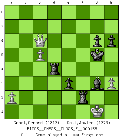 Last move : 0-1 2013 February 27 14:13:59 [Event "FICGS__CHESS__CLASS_E__000158"] [Site "FICGS"] [Date "2013.01.07"] [Round "1"] [White "Gonet,Gerard"] [Black "Goti,Javier"] [Result "0-1"] [WhiteElo "1212"] [BlackElo "1273"] 1.d4 g6 2.e4 Bg7 3.c4 d6 4.Nc3 c5 5.Be3 b6 6.Nf3 Bg4 7.Be2 cxd4 8.Bxd4 e5 9.Be3 Nc6 10.h3 Bxf3 11.Bxf3 Nd4 12.O-O Nxf3+ 13.Qxf3 a6 14.Nd5 f6 15.Bxb6 Qxb6 16.Nxb6 Rb8 17.Na4 Ne7 18.b3 O-O 19.Nc3 f5 20.Rad1 fxe4 21.Qxe4 Nf5 22.Qd5+ Kh8 23.Ne4 Rfd8 24.Qe6 Nd4 25.Qe7 Nf5 26.Qa7 Ra8 27.Qc7 Rac8 28.Qa5 Ra8 29.Qb4 a5 30.Qa3 Bf8 31.Rd5 h6 32.Rxa5 Rac8 33.Rd1 Nd4 34.Ra6 d5 35.c5 dxe4 36.b4 Kh7 37.Qe3 Nc2 38.Qe2 Nxb4 39.Ra7+ Bg7 40.Qxe4 Rxd1+ 41.Kh2 Nc6 42.Ra6 Rd4 43.Qe3 e4 44.Rxc6 Rxc6 45.Qa3 Be5+ 46.g3 Rf6 47.Qe3 Rf3 48.Qe1 e3 49.Qb1 Rxf2+ 50.Kg1 Bxg3 51.Qb7+ Kg8 52.Qc8+ Kg7 53.Qb7+ Kf6 54.Qc6+ Kg5 0-1 Modern defense Kingside Castling by player White (move 12) Kingside Castling by player Black (move 18) Player Black won this chess game. Follow this game move after move (download)To avoid losing a piece, many a person has lost the game. (Savielly Tartakover) Auf Remis zu spielen ist gewissermaßen ein Verbrechen gegen das Schachspiel. (Mikhail Nekhemyevich Tal) Muchos se han convertido en Maestros de Ajedrez, nadie se ha convertido en el Maestro del Ajedrez. (Siegbert Tarrasch) C'est une question de caractère, Beaucoup de gens perdent leur motivation très vite. D'autres, ils sont rares, peuvent la conserver très longtemps. J'aime les échecs, encore aujourd'hui je suis heureux d'analyser des parties. J'aime toujours gagner, je déteste encore perdre. Bien jouer est important pour mon intégrité intellectuelle et morale. Et puis les échecs vivent en ce moment une période historique grâce à Internet. Ils se développent dans les systèmes éducatifs à travers le monde. Ils sortent de leur ghetto, et c'est mon rôle de mener à bien cette révolution. (Gary Kasparov) Lamb in skin of tiger, still fears the wolf. (Chinese proverb)