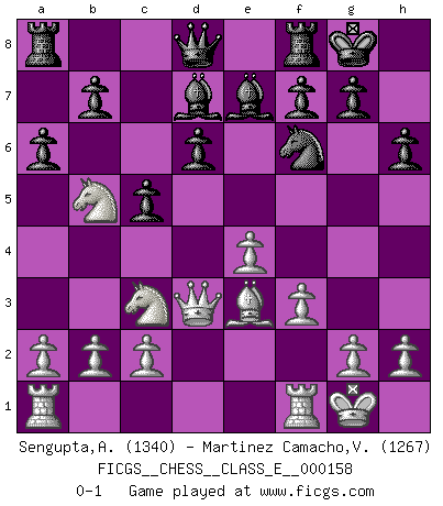 Last move : 0-1 2013 April 5 8:31:30 [Event "FICGS__CHESS__CLASS_E__000158"] [Site "FICGS"] [Date "2013.01.07"] [Round "1"] [White "Sengupta,Arnab"] [Black "Martinez Camacho,Victor Hugo"] [Result "0-1"] [WhiteElo "1340"] [BlackElo "1267"] 1.e4 e5 2.Nf3 Nc6 3.Bb5 d6 4.O-O Nf6 5.d4 Bd7 6.Nc3 Be7 7.Bxc6 Bxc6 8.Qd3 exd4 9.Nxd4 Bd7 10.Bg5 h6 11.Be3 O-O 12.f3 c5 13.Ndb5 a6 0-1 Ruy Lopez : Old Steinitz defense Kingside Castling by player White (move 4) Kingside Castling by player Black (move 11) Player Black won this chess game. Follow this game move after move (download)The older I grow, the more I value Pawns. (Keres) Die starken Figuren des Gegners muss man abtauschen. (José Raúl Capablanca) El Ajedrez demanda una total concentración. (Bobby Fischer) Les pièces de l'échiquier étaient impitoyables. Elles le retenaient, elles l'absorbaient. Il y avait de l'horreur en cela, mais aussi une harmonie unique. Car, qu'y a-t-il dans le monde, à part les échecs ? (V. Nabokov) There is no instance of a country having benefited from prolonged warfare. (Sun Tzu)