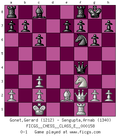 Last move : 0-1 2013 January 7 15:39:11 [Event "FICGS__CHESS__CLASS_E__000158"] [Site "FICGS"] [Date "2013.01.07"] [Round "1"] [White "Gonet,Gerard"] [Black "Sengupta,Arnab"] [Result "0-1"] [WhiteElo "1212"] [BlackElo "1340"] 1.d4 d5 2.e4 dxe4 3.Nc3 Nf6 4.f3 exf3 5.Qxf3 Qxd4 6.Be3 Qb4 7.O-O-O c6 8.Rd4 Qa5 9.Be2 g6 10.Ra4 Qc7 11.Qf2 Nbd7 12.Nf3 Bg7 13.Rf1 O-O 14.Ng5 Nd5 15.Bd2 Nxc3 16.Bxc3 Bxc3 17.bxc3 Nf6 18.Rf4 Qe5 19.Nf3 Qxf4+ 0-1 Blackmar gambit Queenside Castling by player White (move 7) Kingside Castling by player Black (move 13) Player Black won this chess game. Follow this game move after move (download)Chess is no whit inferior to the violin, and we have a large number of professional violinists. (Mikhail Botvinnik) Schach verlangt totale Konzentration. (Robert James Fischer) Por tratar de evitar la pérdida de una pieza, muchas personas han perdido una partida de Ajedrez. (Savielly Tartakover) On peut tirer plus d'utilité d'une partie perdue que de 100 parties gagnées. (Capablanca) Creativity is inventing, experimenting, growing, taking risks, breaking rules, making mistakes, and having fun. (Mary Lou Cook)