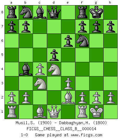 Last move : 1-0 2007 March 9 19:4:57 [Event "FICGS__CHESS__CLASS_B__000014"] [Site "FICGS"] [Date "2007.01.23"] [Round "1"] [White "Musil,Stanislav"] [Black "Dabbaghyan,Hossein"] [Result "1-0"] [WhiteElo "1900"] [BlackElo "1800"] 1.Nf3 c5 2.c4 Nf6 3.d4 cxd4 4.Nxd4 e6 5.Nc3 Bb4 6.e3 O-O 7.Be2 d5 8.O-O 1-0 This chess game has been lost on time (started : 2007.01.23 10:36:36) Reti Opening Kingside Castling by player Black (move 6) Kingside Castling by player White (move 8) Player White won this chess game. Follow this game move after move (download)Openings teach you openings. Endgames teach you chess ! (Stephan Gerzadowicz) Charakterschwächen offenbaren sich normalerweise während einer Schachpartie. (Garry Kasparov) No hay precio que sea tan grande por la cabellera del Rey enemigo. (Koblentz) Shah mat. Le roi est mort. Cri de fierté d'un joueur venant de terrasser son adversaire, courtoisement, sans effusion de sang. I think your argument is specious - I think your tie is ugly. (Gregory House to Dr. Foreman, House M.D.)