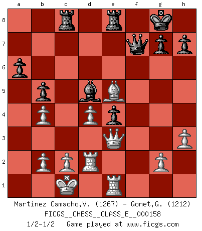 Last move : 1/2-1/2 2013 February 19 2:10:25 [Event "FICGS__CHESS__CLASS_E__000158"] [Site "FICGS"] [Date "2013.01.07"] [Round "1"] [White "Martinez Camacho,Victor Hugo"] [Black "Gonet,Gerard"] [Result "1/2-1/2"] [WhiteElo "1267"] [BlackElo "1212"] 1.e4 e5 2.Nf3 f5 3.exf5 e4 4.Ng1 d5 5.d4 Nf6 6.h3 Bxf5 7.Nc3 Nc6 8.Bb5 Qd6 9.Nge2 Be7 10.Bf4 Qe6 11.Ba4 O-O 12.Bxc7 Bb4 13.Bb3 Qe7 14.Bf4 Nh5 15.Bd2 Bxc3 16.Nxc3 Be6 17.Qe2 Nf6 18.O-O-O Rae8 19.Be3 a6 20.Rhe1 Bf7 21.f3 Na5 22.fxe4 Nxb3+ 23.axb3 Nxe4 24.Nxe4 dxe4 25.Bd2 Qh4 26.Be3 Rc8 27.b4 b5 28.Qd2 Qg3 29.Bf4 Qg6 30.Qe3 Rfe8 31.Be5 Bd5 32.Rd2 Qf7 1/2-1/2 Latvian counter-gambit Kingside Castling by player Black (move 11) Queenside Castling by player White (move 18) This chess game ended in a draw. Follow this game move after move (download)There must have been a time when men were demigods, or they could not have invented Chess. (Gustav Schenk) Habe Mut, dich deines eigenen Verstandes zu bedienen. (Immanuel Kant) No es una movida, aún la mejor movida que tu debas buscar, sino un plan comprensible. (Eugene Znosko-Borovsky) Le moment que je préfère le plus dans une rencontre, c'est celui où je sens que la personnalité de l'adversaire se brise. (Robert Fischer) The meaning of life is that it is to be lived, and it is not to be traded and conceptualized and squeezed into a pattern of systems. (Bruce Lee)