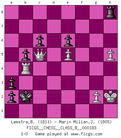 Last move : 1-0 2013 August 28 0:48:35 [Event "FICGS__CHESS__CLASS_B__000183"] [Site "FICGS"] [Date "2013.01.07"] [Round "1"] [White "Lemstra,Bart"] [Black "Marin Millan,Jose Antonio"] [Result "1-0"] [WhiteElo "1811"] [BlackElo "1805"] 1.d4 d5 2.c4 c6 3.Nc3 Nf6 4.Nf3 e6 5.Bg5 h6 6.Bh4 dxc4 7.e4 g5 8.Bg3 b5 9.Be2 Bb7 10.h4 g4 11.Ne5 h5 12.O-O Nbd7 13.Qc2 a5 14.Rad1 Bg7 15.Nxd7 Qxd7 16.f3 gxf3 17.Bxf3 a4 18.Qe2 a3 19.e5 Nd5 20.Ne4 Bf8 21.b3 cxb3 22.Bxh5 Rh7 23.Bxf7+ Rxf7 24.Qh5 bxa2 25.Nd6+ Kd8 26.Rxf7 Be7 27.Qf3 Bc8 28.h5 Qa7 29.Kh2 Bd7 30.Rxe7 Nxe7 31.Bh4 Kc7 32.Bxe7 Qa4 33.Ne4 Qc2 34.Bd6+ Kb6 35.Nf6 Be8 36.Nxe8 Rxe8 37.Qf7 Rh8 38.Bc5+ Qxc5 39.dxc5+ Kxc5 40.Qa7+ Kb4 41.Rd4+ Kc3 42.Qc5+ Kb2 43.Rb4+ 1-0 QGD Slav defense Kingside Castling by player White (move 12) Player White won this chess game. Follow this game move after move (download)When you don't know what to play, wait for an idea to come into your opponent's mind. You may be sure that idea will be wrong. (Siegbert Tarrasch) Es gibt nur zwei wahre Schachgenies - das andere war Wilhelm Steinitz, der Weltmeister von 1872 bis 1894. (Robert James Fischer) Bobby Fischer es el jugador de Ajedrez mas grande que jamás haya existido. (Ken Smith) Il n'y a pas de prix trop élevé au scalp de l'ennemi. (Koblentz) We're missing something. (Gregory House, House M.D.)