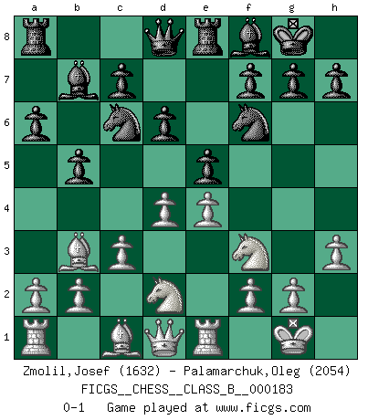 Last move : 0-1 2013 May 19 23:3:26 [Event "FICGS__CHESS__CLASS_B__000183"] [Site "FICGS"] [Date "2013.01.07"] [Round "1"] [White "Zmolil,Josef"] [Black "Palamarchuk,Oleg"] [Result "0-1"] [WhiteElo "1632"] [BlackElo "2054"] 1.e4 e5 2.Nf3 Nc6 3.Bb5 a6 4.Ba4 Nf6 5.O-O Be7 6.Re1 b5 7.Bb3 d6 8.c3 O-O 9.h3 Bb7 10.d4 Re8 11.Nbd2 Bf8 0-1 This chess game has been lost on time (started : 2013.01.07 19:6:46) Ruy Lopez : Closed Kingside Castling by player White (move 5) Kingside Castling by player Black (move 8) Player Black won this chess game. Follow this game move after move (download)I still hope to kill Fischer. (Boris Spassky) Über die Verhaftung Bobby Fischers: Warum es die Bush-Administration für nötig befindet einen 61 Jahre alten Mann zu hetzten, der für niemanden ausser sich selbste eine Gefahr darstellt ist ein Rätsel. (Nigel Short) Cada Peón es una Reina en potencia. (James Mason) Même si l'adversaire joue le coup analysé précédemment, recommencez l'analyse en voyant la nouvelle position. Première règle de Blumenfeld Whenever people agree with me, I always feel I must be wrong. (Oscar Wilde)