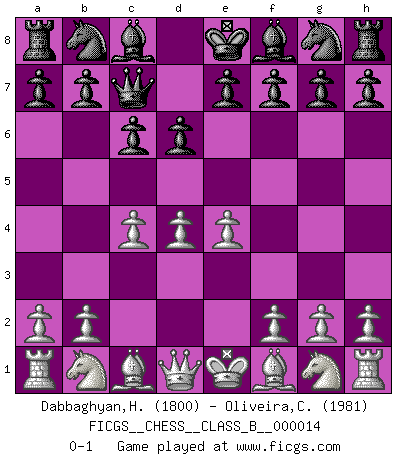 Last move : 0-1 2007 March 11 19:16:44 [Event "FICGS__CHESS__CLASS_B__000014"] [Site "FICGS"] [Date "2007.01.23"] [Round "1"] [White "Dabbaghyan,Hossein"] [Black "Oliveira,Carlos"] [Result "0-1"] [WhiteElo "1800"] [BlackElo "1981"] 1.e4 c6 2.d4 d6 3.c4 Qc7 0-1 This chess game has been lost on time (started : 2007.01.23 10:36:36) Caro-Kann defense Player Black won this chess game. Follow this game move after move (download)Chess mastery essentially consists of analyzing Chess positions accurately. (Mikhail Botvinnik) Die Elozahlen sind sehr schlecht für das Schach. Jetzt ist Schach eine Sportindustrie, die darauf zielt Elopunkte zu machen. (Miguel Najdorf) El estómago es una parte esencial del maestro de Ajedrez. (Bent Larsen) L'attaque fait le spectacle, la défense gagne les matchs. (Dicton footballistique) There are more things in heaven and earth than practically anywhere else. (Unknown)