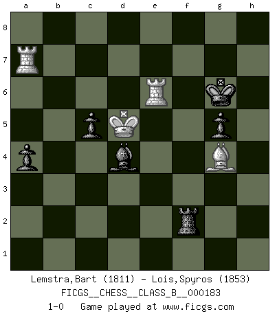 Last move : 1-0 2013 June 18 22:5:41 [Event "FICGS__CHESS__CLASS_B__000183"] [Site "FICGS"] [Date "2013.01.07"] [Round "1"] [White "Lemstra,Bart"] [Black "Lois,Spyros"] [Result "1-0"] [WhiteElo "1811"] [BlackElo "1853"] 1.d4 Nf6 2.c4 g6 3.Nc3 Bg7 4.e4 d6 5.h3 O-O 6.Bg5 c5 7.d5 a6 8.a4 Qb6 9.Ra3 a5 10.Nf3 Na6 11.Be2 Nb4 12.O-O e6 13.Nd2 Bd7 14.Kh1 Rad8 15.f4 Qc7 16.e5 dxe5 17.fxe5 Qxe5 18.Nf3 Qf5 19.g4 Nxg4 20.hxg4 Qxg4 21.Bxd8 Rxd8 22.Rf2 Bc6 23.Qg1 Qxg1+ 24.Kxg1 exd5 25.cxd5 Nxd5 26.Nxd5 Bxd5 27.Rd3 Bf6 28.Rf1 Kg7 29.Rfd1 Bxf3 30.Bxf3 Bd4+ 31.Kg2 b6 32.Re3 Rb8 33.Re7 Kf6 34.Rde1 b5 35.axb5 Rxb5 36.Bd5 Rxb2+ 37.Kh3 Kg5 38.Rxf7 a4 39.Rxh7 Rc2 40.Re6 Rc3+ 41.Kg2 Rc2+ 42.Kf3 Rf2+ 43.Kg3 Rf1 44.Bc4 Rd1 45.Ra7 Kf5 46.Re2 g5 47.Be6+ Kf6 48.Bg4 Rg1+ 49.Kf3 Rf1+ 50.Ke4 Rf4+ 51.Kd5 Kg6 52.Re4 Rf2 53.Re6+ 1-0 King's Indian : Makagonov system (5.h3) Kingside Castling by player Black (move 5) Kingside Castling by player White (move 12) 10 pieces endgame at move 39 : White KRRB , Black KRBPPP WHITE : King + 2 Rooks 1 Bishop BLACK : King + 1 Rook 1 Bishop 3 Pawns Player White won this chess game. Follow this game move after move (download)The way he plays Chess demonstrates a man's whole nature. (Stanley Ellin) Schach ist ein Reich, wo sich die menschliche Phantasie frei entfalten kann. (David Bronstein) El Ajedrez, como la música, como el amor, tiene el poder de hacer feliz a la gente. (Siegbert Tarrasch) Les échecs sont un jeu terrible. Si vous n'avez pas le centre, votre adversaire a une position plus libre. Par contre, si vous avez le centre, alors vous avez vraiment quelque chose pour laquelle vous inquiéter ! (Siegbert Tarrasch) There is far too much law for those who can afford it and far too little for those who cannot. (Derek Bok)