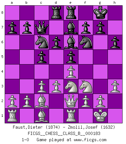 Last move : 1-0 2013 May 20 11:3:3 [Event "FICGS__CHESS__CLASS_B__000183"] [Site "FICGS"] [Date "2013.01.07"] [Round "1"] [White "Faust,Dieter"] [Black "Zmolil,Josef"] [Result "1-0"] [WhiteElo "1874"] [BlackElo "1632"] 1.e4 c5 2.Nf3 d6 3.c3 Nf6 4.Bd3 Nc6 5.h3 e5 6.O-O Be7 7.Bc2 O-O 8.d3 h6 9.Nbd2 Be6 10.Re1 Qc7 11.Nf1 Rad8 12.Qe2 Rfe8 13.Ne3 1-0 This chess game has been lost on time (started : 2013.01.07 19:6:46) Sicilian Kingside Castling by player White (move 6) Kingside Castling by player Black (move 7) Player White won this chess game. Follow this game move after move (download)What is the difference between chess and football? Everybody understands football, but nobody plays it. Everybody plays chess, but nobody understands it. Everything is relative. (Vladimir Kramnik) Mutter, ich bin eben Ex-Weltmeister geworden. --beim nach Hause Kommen nach dem Verlust des WM-Titels an Mihail Botvinnik -- (Mikhail Nekhemyevich Tal) Todos los jugadores de Ajedrez deberían tener un pasatiempo. (Savielly Tartakower) On est toujours la mazette de quelqu'un d'autre. (Anonyme) Now be brave and don't look back. Don't look back. (Shmi Skywalker in Star Wars ep.1)