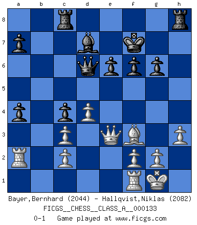 Last move : 0-1 2013 August 29 12:56:12 [Event "FICGS__CHESS__CLASS_A__000133"] [Site "FICGS"] [Date "2013.01.07"] [Round "1"] [White "Bayer,Bernhard"] [Black "Hallqvist,Niklas"] [Result "0-1"] [WhiteElo "2044"] [BlackElo "2082"] 1.e4 e6 2.d4 d5 3.Nc3 Bb4 4.e5 c5 5.a3 Bxc3+ 6.bxc3 Qa5 7.Bd2 Ne7 8.Nf3 Nbc6 9.Be2 Qa4 10.Qb1 c4 11.O-O Bd7 12.Nh4 Qa5 13.Qe1 Ng6 14.Nxg6 hxg6 15.h3 Ne7 16.Bg5 b6 17.Ra2 Ng8 18.a4 f6 19.Bf4 Ne7 20.exf6 gxf6 21.Bd6 b5 22.Bb4 Qa6 23.Bf3 bxa4 24.Bxe7 Kxe7 25.Bxd5 Rac8 26.Bf3 Kf7 27.Qe3 Qd6 0-1 This chess game has been lost on time (started : 2013.01.07 21:1:30) French : Winawer, Advance variation Kingside Castling by player White (move 11) Player Black won this chess game. Follow this game move after move (download)I feel as if I were a piece in a game of Chess, when my opponent says of it: That piece cannot be moved. (Soren Kierkegaard) Wer nie einen Fehler gemacht hat, hat nie etwas Neues ausprobiert. (Albert Einstein) Las Aperturas te enseñan aperturas. ¡Los Finales te enseñan Ajedrez!. (Stephan Gerzadowicz) Pour moi, les échecs ne sont pas un jeu mais un art. (Alexandre Alekhine) The difference between perseverance and obstinacy is that one comes from a strong will, and the other from a strong won't. (Henry Ward Beecher)