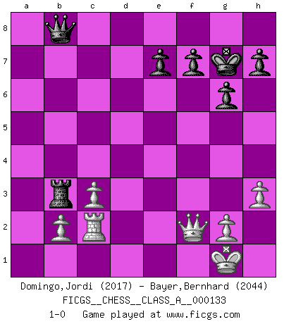 Last move : 1-0 2013 September 25 14:58:0 [Event "FICGS__CHESS__CLASS_A__000133"] [Site "FICGS"] [Date "2013.01.07"] [Round "1"] [White "Domingo,Jordi"] [Black "Bayer,Bernhard"] [Result "1-0"] [WhiteElo "2017"] [BlackElo "2044"] 1.e4 c5 2.Nf3 d6 3.c3 Nf6 4.Be2 g6 5.O-O Bg7 6.Bb5+ Bd7 7.Bxd7+ Qxd7 8.Re1 O-O 9.d4 Na6 10.Bg5 Rfe8 11.Qb3 Rac8 12.e5 c4 13.Qa3 dxe5 14.Nxe5 Qf5 15.Nf3 Ne4 16.Be3 Nc7 17.Qxa7 Ra8 18.Qxb7 Nd5 19.Bf4 Nxf2 20.Be5 Nd3 21.Qxd5 Nxe1 22.Nxe1 Rxa2 23.Rxa2 Qxb1 24.Qxc4 Bxe5 25.dxe5 Qxe1+ 26.Qf1 Qxe5 27.Ra1 Rb8 28.Qf2 Rb3 29.Rd1 Kg7 30.h3 Qc7 31.Rc1 Qb8 32.Rc2 1-0 This chess game has been lost on time (started : 2013.01.07 21:1:30) Sicilian Kingside Castling by player White (move 5) Kingside Castling by player Black (move 8) Player White won this chess game. Follow this game move after move (download)The Pawns are the soul of the game. (Francois Andre Danican Philidor) Wenn es im Universum noch irgendwo intelligente Lebewesen gibt, dann kennen sie Go. (Emanuel Lasker) Las leyes del Ajedrez no permiten una libre elección: tienes que mover quieras o no. (Emanuel Lasker) Il (Jacob Murray) ne joue pas pour le bon coup, mais pour le meilleur. (Eloi Relange) We need strong personalities and only one world champion to attract sponsors. (Anatoly Karpov)