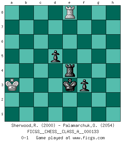 Last move : 0-1 2013 February 26 9:0:2 [Event "FICGS__CHESS__CLASS_A__000133"] [Site "FICGS"] [Date "2013.01.07"] [Round "1"] [White "Sherwood,Russell"] [Black "Palamarchuk,Oleg"] [Result "0-1"] [WhiteElo "2000"] [BlackElo "2054"] 1.e4 c5 2.Nf3 d6 3.d4 cxd4 4.Nxd4 Nf6 5.Nc3 a6 6.Be3 e5 7.Nb3 Be6 8.f3 h5 9.Nd5 Bxd5 10.exd5 Nbd7 11.c4 g6 12.Qd2 Bg7 13.Na5 e4 14.Nxb7 Qc7 15.Na5 O-O 16.Nc6 Rfe8 17.O-O-O Nb8 18.Nb4 a5 19.Nc2 Nbd7 20.Na3 exf3 21.gxf3 Rab8 22.Bd4 Ne5 23.Be2 Nxd5 24.Kb1 Nb6 25.Rc1 d5 26.c5 Na4 27.b3 Rb4 28.Nc2 Rb7 29.Rhd1 Nxc5 30.Na3 Nxb3 31.axb3 Rxb3+ 32.Ka2 Qb8 33.Rc3 a4 34.Ka1 Bf8 35.Nb1 Bb4 36.Qf4 Bxc3+ 37.Bxc3 Qd6 38.Ka2 Rc8 39.Qxe5 Qxe5 40.Bxe5 Rc2+ 41.Ka1 Rxe2 42.f4 Rxh2 43.Nc3 f6 44.Bxf6 Kf7 45.Be5 Rh3 46.Ne2 Rhd3 47.Rh1 h4 48.Nd4 Rb4 49.Ka2 Rbxd4 50.Bxd4 Rxd4 51.Rxh4 g5 52.Rh7+ Kg6 53.Rh8 gxf4 54.Rg8+ Kf5 55.Kb2 a3+ 56.Kxa3 f3 57.Rf8+ Ke4 58.Re8+ Kd3 59.Rf8 Ke3 60.Re8+ Re4 0-1 Sicilian : Najdorf, Byrne (English) attack Kingside Castling by player Black (move 15) Queenside Castling by player White (move 17) 10 pieces endgame at move 50 : White KRBP , Black KRPPPP WHITE : King + 1 Rook 1 Bishop 1 Pawn BLACK : King + 1 Rook 4 Pawns 9 pieces endgame at move 50 : White KRP , Black KRPPPP WHITE : King + 1 Rook 1 Pawn BLACK : King + 1 Rook 4 Pawns 8 pieces endgame at move 51 : White KRP , Black KRPPP WHITE : King + 1 Rook 1 Pawn BLACK : King + 1 Rook 3 Pawns 7 pieces endgame at move 53 : White KR , Black KRPPP WHITE : King + 1 Rook BLACK : King + 1 Rook 3 Pawns 6 pieces endgame at move 56 : White KR , Black KRPP WHITE : King + 1 Rook BLACK : King + 1 Rook 2 Pawns Player Black won this chess game. Follow this game move after move (download)The older I grow, the more I value pawns. (Paul Keres) Um dein Spiel zu verbessern musst du zuallererst das Endspiel studieren, denn diese kann unabhängig studiert werden. Die Eröffnung und das Mittelspiel müssen immer in Bezug gesetzt werden zum Endspiel. (José Raúl Capablanca) Ciertamente el estado mental actual de Bobby Fischer es una tragedia. Uno de los mas grandes jugadores de Ajedrez del mundo -el orgullo y pena del Ajedrez Americano. (Frank Brady) Même si l'adversaire joue le coup analysé précédemment, recommencez l'analyse en voyant la nouvelle position. Première règle de Blumenfeld However beautiful the strategy, you should occasionally look at the results. (Winston Churchill)