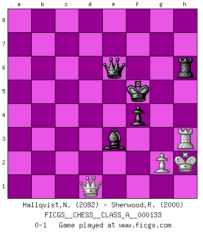 Last move : 0-1 2014 April 30 8:42:17 [Event "FICGS__CHESS__CLASS_A__000133"] [Site "FICGS"] [Date "2013.01.07"] [Round "1"] [White "Hallqvist,Niklas"] [Black "Sherwood,Russell"] [Result "0-1"] [WhiteElo "2082"] [BlackElo "2000"] 1.e4 e5 2.f4 exf4 3.Bc4 Nf6 4.Nc3 c6 5.Bb3 d5 6.exd5 cxd5 7.d4 Bd6 8.Nge2 O-O 9.O-O g5 10.Nxd5 Nxd5 11.Bxd5 Nc6 12.c3 Bg4 13.Qd3 Bc7 14.Bb3 Ne5 15.Qc2 Ng6 16.Rf2 Re8 17.Bc4 Qd7 18.Bd2 Bb6 19.Qb3 Ne5 20.Bb5 Nc6 21.Raf1 Rad8 22.Nxf4 gxf4 23.Rxf4 Be6 24.Qd1 Rf8 25.Kh1 f5 26.b3 Bc7 27.R4f2 a6 28.Bc4 Ne7 29.Bd3 Rde8 30.Qh5 b5 31.Re1 Ng6 32.Bh6 Rf7 33.Rfe2 R8e7 34.Bg5 Nf4 35.Bxf4 Bxf4 36.Qh4 Bd6 37.c4 Bb4 38.Rf1 Qd6 39.Rf3 f4 40.h3 bxc4 41.bxc4 Qxd4 42.Rxe6 Rxe6 43.Qg4+ Rg6 44.Bxg6 hxg6 45.Qxg6+ Qg7 46.Qxa6 Qa1+ 47.Kh2 Qe5 48.a4 Kh7 49.Qb6 Bc5 50.Qd8 Qe1 51.Qd3+ Kh6 52.Qf1 Qe5 53.Kh1 Be3 54.Qe1 Rg7 55.Qh4+ Kg6 56.Kh2 Bb6 57.Qg4+ Kh7 58.Qh4+ Kg8 59.c5 Qxc5 60.Qe1 Rg6 61.Kh1 Qc6 62.Qd2 Be3 63.Qd3 Kg7 64.Qa3 Rg5 65.Qa1+ Kf7 66.Qa2+ Ke7 67.Qa3+ Kd8 68.Qb2 Qc4 69.Qh8+ Kd7 70.Qh7+ Kc8 71.Qh8+ Rg8 72.Qb2 Rg6 73.Kh2 Rb6 74.Qh8+ Kb7 75.Qh7+ Kb8 76.Qh8+ Ka7 77.Qh7+ Ka6 78.Qf5 Rb3 79.Qf6+ Ka5 80.Qd8+ Kxa4 81.Qd1 Kb5 82.h4 Qe6 83.Qe2+ Kb6 84.Qa2 Qg8 85.Qa1 Qg6 86.Qe5 Rb5 87.Qb8+ Ka5 88.Qc7+ Rb6 89.Qa7+ Kb5 90.Qd7+ Kb4 91.Qd5 Rd6 92.Qb7+ Kc5 93.Qc8+ Rc6 94.Qb7 Rd6 95.Qc8+ Kb6 96.Qb8+ Kc6 97.Qc8+ Kb5 98.Qb7+ Kc4 99.Qc8+ Kd4 100.Kh3 Rc6 101.Qd7+ Ke4 102.Qb7 Qe6+ 103.Kh2 Kf5 104.Qb1+ Qe4 105.Qb3 Rh6 106.Qf7+ Kg4 107.Qg7+ Qg6 108.Qd7+ Qe6 109.Qd1 Kxh4 110.Rh3+ Kg5 111.Qd8+ Kg4 112.Qd1+ Kf5 0-1 KGA : Bishop's gambit, Jaenisch variation Kingside Castling by player Black (move 8) Kingside Castling by player White (move 9) 10 pieces endgame at move 80 : White KQRPP , Black KQRBP WHITE : King + 1 Queen 1 Rook 2 Pawns BLACK : King + 1 Queen 1 Rook 1 Bishop 1 Pawn 9 pieces endgame at move 109 : White KQRP , Black KQRBP WHITE : King + 1 Queen 1 Rook 1 Pawn BLACK : King + 1 Queen 1 Rook 1 Bishop 1 Pawn Player Black won this chess game. Follow this game move after move (download)If you aren't afraid of Spassky, then I have removed the element of money. (Jim Slater) Im Reiche der Wirklichkeit ist man nie so glücklich wie im Reiche der Gedanken. (Arthur Schopenhauer) Por tratar de evitar la pérdida de una pieza, muchas personas han perdido una partida de Ajedrez. (Savielly Tartakover) On croit qu'il y a plus de mauvais joueurs que de bons joueurs, c'est faux : Il y a autant de joueurs qui gagnent que de joueurs qui perdent. (Philippe Geluck) The weakness of an artist is dogma. (Josh Waitzkin)