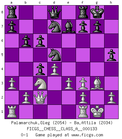 Last move : 0-1 2013 January 10 19:2:50 [Event "FICGS__CHESS__CLASS_A__000133"] [Site "FICGS"] [Date "2013.01.07"] [Round "1"] [White "Palamarchuk,Oleg"] [Black "Ba,Attila"] [Result "0-1"] [WhiteElo "2054"] [BlackElo "2034"] 1.d4 Nf6 2.Nf3 e6 3.c4 b6 4.a3 Bb7 5.Nc3 d5 6.Bg5 Be7 7.e3 O-O 8.Qc2 Nbd7 9.cxd5 exd5 10.Bc4 dxc4 11.O-O Bxf3 12.gxf3 c6 13.Bh4 Nd5 14.Bg3 h5 0-1 Queen's pawn game Kingside Castling by player Black (move 7) Kingside Castling by player White (move 11) Player Black won this chess game. Follow this game move after move (download)It is peculiar but a fact nevertheless, that gamblers in chess always have enthusiastic followers. (Botvinnik) Wenn man heute mit 14 Jahren noch kein GM ist, kann man es vergessen. (Viswanathan Anand) Cuando no sepas que mover, espera por una idea que se le venga a la la cabeza de tu oponente. Tenlo por seguro de que esa idea estará incorrecta. (Siegbert Tarrasch) Les ravages du H expliquent la différence de niveau entre Tal et Thal [Abergel]. That's absurd. I love it. (Gregory House, House M.D.)