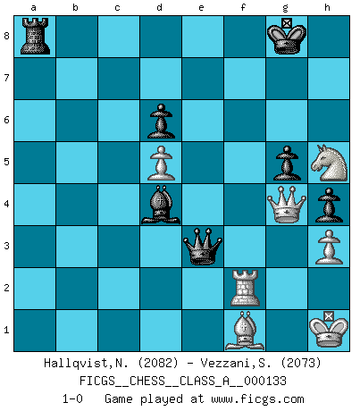Last move : 1-0 2013 December 9 9:10:29 [Event "FICGS__CHESS__CLASS_A__000133"] [Site "FICGS"] [Date "2013.01.07"] [Round "1"] [White "Hallqvist,Niklas"] [Black "Vezzani,Stefano"] [Result "1-0"] [WhiteElo "2082"] [BlackElo "2073"] 1.c4 e5 2.g3 Nc6 3.Bg2 g6 4.Nc3 Bg7 5.Rb1 a5 6.a3 d6 7.e3 Nf6 8.Nge2 O-O 9.O-O Be6 10.b3 Qd7 11.d4 exd4 12.exd4 Bf5 13.Rb2 Rfe8 14.f3 h5 15.Bg5 Nh7 16.Bf4 Na7 17.Qd2 Nc8 18.Bh6 Bh8 19.d5 a4 20.Nxa4 b5 21.Nac3 bxc4 22.bxc4 Nb6 23.Rb4 Rxa3 24.Ne4 Bxe4 25.fxe4 Nf6 26.Qc2 Ng4 27.Bc1 Ra4 28.Qb3 Rxb4 29.Qxb4 Qa4 30.Qb5 Ra8 31.h3 Ne5 32.Bf4 Qa7 33.Be3 Qa3 34.Bxb6 cxb6 35.Qxb6 Qd3 36.Nf4 Qxg3 37.Ne2 Qg5 38.Qb3 Qd2 39.Nf4 h4 40.Qd1 Qe3+ 41.Kh1 g5 42.Nh5 Nxc4 43.Qg4 Nd2 44.Rxf7 Bd4 45.Bf1 Nxe4 46.Rf3 Nf2+ 47.Rxf2 1-0 This chess game has been lost on time (started : 2013.01.07 21:1:30) English Opening Kingside Castling by player Black (move 8) Kingside Castling by player White (move 9) Player White won this chess game. Follow this game move after move (download)The essence of Chess is thinking about what Chess is. (David Bronstein) Besser ein falscher Plan, logisch durchgeführt, als gar kein Plan. (Viktor Kortschnoi) Tu no necesitas jugar muy bien, únicamente ayudar a tu oponenet a que juegue muy mal. (Genrikh Chepukaitis) Une platitude souvent récitée à propos des Echecs est qu'une des choses les plus difficiles à réaliser est de gagner une position gagnante. Cela ne manque pas de sens mais, pour ma part, j'ai toujours trouvé plus difficile de gagner une position perdante. (Tim Krabbe) Luck has a peculiar habit of favoring those who don't depend on it. (Author unknown)