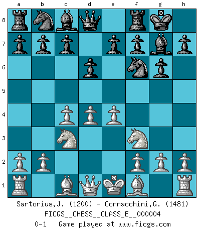Last move : 0-1 2006 August 26 18:45:33 [Event "FICGS__CHESS__CLASS_E__000004"] [Site "FICGS"] [Date "2006.05.16"] [Round "1"] [White "Sartorius,Julien"] [Black "Cornacchini,Gabriele"] [Result "0-1"] [WhiteElo "1200"] [BlackElo "1481"] 1.d4 Nf6 2.c4 g6 3.Nf3 Bg7 4.Nc3 O-O 5.e4 d6 0-1 This chess game has been lost on time (started : 2006.05.16 12:49:50) King's Indian, 3.Nf3 Kingside Castling by player Black (move 4) Player Black won this chess game. Follow this game move after move (download)When in doubt... play Chess ! (Tevis) Schach wird sich dank seiner hohen kulturellen Tradition immer durchsetzen. In näherer Zukunft womöglich sogar als Gegenreaktion auf die maßlose Reizüberflutung im Freizeit- und Spielbereich. (Garry Kasparov) a manera como él juega al Ajedrez, demuestra la completa naturaleza de un hombre. (Stanley Ellin) Je fais ceci parce que dans cinquante coups j'obtiendrai cela; je m'appelle Mikhail Moisevitch Botvinnik. (Botvinnik) Happy endings are just stories that haven't finished yet. (Jane Smith in Mr & Mrs Smith)