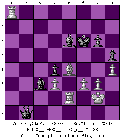 Last move : 0-1 2013 April 29 16:22:30 [Event "FICGS__CHESS__CLASS_A__000133"] [Site "FICGS"] [Date "2013.01.07"] [Round "1"] [White "Vezzani,Stefano"] [Black "Ba,Attila"] [Result "0-1"] [WhiteElo "2073"] [BlackElo "2034"] 1.g3 e5 2.c4 Nc6 3.Bg2 g6 4.Nc3 Bg7 5.Rb1 a5 6.a3 Nf6 7.b4 axb4 8.axb4 d6 9.e3 O-O 10.Nge2 Ne7 11.O-O d5 12.d3 Be6 13.Qb3 Qd6 14.e4 d4 15.Nd5 Nexd5 16.exd5 Bf5 17.Bg5 Qa6 18.Rfe1 h6 19.Bxf6 Qxf6 20.d6 Qxd6 21.Bxb7 Ra7 22.Bg2 c6 23.Nc1 Rb8 24.Re2 Bf8 25.Ra2 Rab7 26.b5 Rb6 27.Rc2 Be6 28.Qb2 Qc7 29.Nb3 cxb5 30.cxb5 Qa7 31.Nd2 Rxb5 32.Qxb5 Rxb5 33.Rxb5 Qa4 34.R5b2 Bb4 35.Bc6 Qa5 36.Be4 f5 37.Bf3 e4 38.Nxe4 fxe4 39.Bxe4 Qa1+ 40.Kg2 Bc3 41.Rb8+ Kf7 42.Rb7+ Kf6 43.Rb6 Qa5 44.Rb8 Qa7 45.Ra8 Qb6 46.Re2 Qb5 47.f3 h5 48.h4 Qb1 0-1 Benko's Opening Kingside Castling by player Black (move 9) Kingside Castling by player White (move 11) Player Black won this chess game. Follow this game move after move (download)He who fears an isolated Queen's Pawn should give up Chess. (Siegbert Tarrasch) Wie, soll nun auch die Opposition abgeschafft werden? Ja, es tut mir leid, Ihnen diesen Schmerz nicht ersparen zu können. (Aaron Nimzowitsch) El hombre es un frívolo, una creatura engañosa y como un jugador de Ajedrez, se preocupa mas por el proceso de obtener su meta que de la meta por sí misma. (Dostoyevsky) Des idées, des idées, j'en ai cent, j'en ai mille. Des bonnes, des mauvaises, applicables, irréalisables... Il suffit de faire le tri ! (Roos) Happy endings are just stories that haven't finished yet. (Jane Smith in Mr & Mrs Smith)