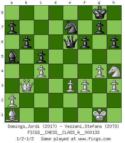 Last move : 1/2-1/2 2013 May 29 19:11:52 [Event "FICGS__CHESS__CLASS_A__000133"] [Site "FICGS"] [Date "2013.01.07"] [Round "1"] [White "Domingo,Jordi"] [Black "Vezzani,Stefano"] [Result "1/2-1/2"] [WhiteElo "2017"] [BlackElo "2073"] 1.b4 e5 2.Bb2 Bxb4 3.Bxe5 Nf6 4.c4 O-O 5.e3 d5 6.cxd5 Nxd5 7.Nf3 c5 8.Be2 Nc6 9.Bb2 Qe7 10.O-O Bf5 11.Nc3 Nxc3 12.dxc3 Rad8 13.Qb3 Ba5 14.Rfd1 Bc7 15.Rxd8 Rxd8 16.Rd1 h6 17.Rxd8+ Nxd8 18.c4 Nc6 19.Bd3 Qd7 20.Bxf5 Qxf5 21.Bc3 Ba5 22.Ba1 b6 23.h3 f6 24.Nh4 Qe4 25.g4 Ne7 26.f3 Qe6 1/2-1/2 Polish (Sokolsky) opening Kingside Castling by player Black (move 4) Kingside Castling by player White (move 10) This chess game ended in a draw. Follow this game move after move (download)If a ruler does not understand Chess, how can he rule over a kingdom ? (King Khusros II) Der vorletzte Fehler gewinnt. (Savielly Grigorievitsch Tartakower) En la perfecta combinación de Ajedrez como en una historia corta de primera clase, toda la trama y contra trama deberá conducir hacia un final sorprendente, el interes no es mitigado hasta el último momento. (Yates and Winter) D'abord les bases : Jouez et étudiez, puis étudiez et jouez, ensuite jouez et étudiez, puis étudiez et jouez. Deuxièmement : Donnez toujours le meilleur de vous-même ! (Ken Smith) Computers are like Old Testament gods; lots of rules and no mercy. (Joseph Campbell)