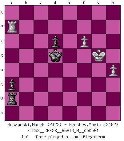 Last move : 1-0 2013 January 23 10:55:2 [Event "FICGS__CHESS__RAPID_M__000061"] [Site "FICGS"] [Date "2013.01.09"] [Round "1"] [White "Soszynski,Marek"] [Black "Genchev,Maxim"] [Result "1-0"] [WhiteElo "2172"] [BlackElo "2187"] 1.d4 Nf6 2.c4 e5 3.dxe5 Ng4 4.Bf4 Bb4+ 5.Nc3 Nc6 6.Nf3 Qe7 7.Qd5 Bxc3+ 8.bxc3 f6 9.exf6 Nxf6 10.Qd3 d6 11.g3 O-O 12.Bg2 Re8 13.O-O Qxe2 14.Qxe2 Rxe2 15.Nd4 Nxd4 16.cxd4 h6 17.Rfe1 Rc2 18.Rec1 Rb2 19.Rcb1 Rc2 20.Bxb7 Bxb7 21.Rxb7 g5 22.Rc1 Rxa2 23.Be3 Ne8 24.h4 gxh4 25.gxh4 a5 26.Bxh6 a4 27.Kg2 a3 28.Kf3 Kf7 29.Be3 Ra5 30.Bg5 Rf5+ 31.Bf4 Ke6 32.d5+ Kd7 33.Ra7 Nf6 34.Rg1 Nh5 35.Kg4 Rxf4+ 36.Kxh5 Ke7 37.Rxc7+ Kf6 38.Re1 Rf5+ 39.Kg4 Re5 40.Rxe5 Kxe5 41.f4+ Ke4 42.Kg5 Kd4 43.Ra7 Kxc4 44.f5 Kxd5 45.f6 1-0 Budapest : Rubinstein variation Kingside Castling by player Black (move 11) Kingside Castling by player White (move 13) 10 pieces endgame at move 40 : White KRPPPP , Black KRPP WHITE : King + 1 Rook 4 Pawns BLACK : King + 1 Rook 2 Pawns 9 pieces endgame at move 43 : White KRPPP , Black KRPP WHITE : King + 1 Rook 3 Pawns BLACK : King + 1 Rook 2 Pawns 8 pieces endgame at move 44 : White KRPP , Black KRPP WHITE : King + 1 Rook 2 Pawns BLACK : King + 1 Rook 2 Pawns Player White won this chess game. Follow this game move after move (download)Fischer is completely natural. He plays no roles. He's like a child. Very, very simple. (Zita Rajcsanyi) Schach ist ein Reich, wo sich die menschliche Phantasie frei entfalten kann. (David Bronstein) Fischer es una tragedia del Ajedrez Americano a la par con Morphy y Pillsbury. (Mig Greengard) Les échecs, c'est la lutte contre l'erreur. (Johannes Zukertort) Your best chance to get a Royal Flush in a casino is in the bathroom. (Anonymous)