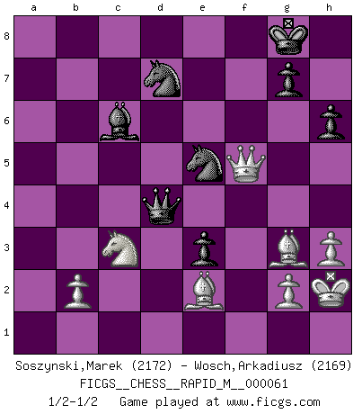 Last move : 1/2-1/2 2013 April 16 14:49:0 [Event "FICGS__CHESS__RAPID_M__000061"] [Site "FICGS"] [Date "2013.01.09"] [Round "1"] [White "Soszynski,Marek"] [Black "Wosch,Arkadiusz"] [Result "1/2-1/2"] [WhiteElo "2172"] [BlackElo "2169"] 1.d4 Nf6 2.c4 e6 3.Nc3 Bb4 4.Qc2 O-O 5.a3 Bxc3+ 6.Qxc3 b6 7.Bg5 Bb7 8.e3 d6 9.Ne2 Nbd7 10.Qc2 c5 11.Rd1 Qe7 12.f3 h6 13.Bh4 Rac8 14.Nc3 d5 15.cxd5 exd5 16.Bf2 c4 17.Be2 Ne8 18.e4 dxe4 19.fxe4 f5 20.O-O fxe4 21.Qa4 a6 22.Bxc4+ Kh8 23.Be2 e3 24.Bg3 Rxf1+ 25.Rxf1 Nef6 26.Re1 b5 27.Qa5 Qe6 28.a4 bxa4 29.Qxa4 Qb6 30.Nd1 Rc1 31.h3 Bc6 32.Qxa6 Qxd4 33.Nc3 Rxe1+ 34.Bxe1 Ne5 35.Bg3 Nfd7 36.Kh2 Kh7 37.Qa1 Qd2 38.Qb1+ Kg8 39.Qf5 Qd4 40.Qc2 Nc5 41.Qf5 Ncd7 1/2-1/2 Nimzo-Indian : Classical variation Kingside Castling by player Black (move 4) Kingside Castling by player White (move 20) This chess game ended in a draw. Follow this game move after move (download)Chess is above all, a fight ! (Emanuel Lasker) Man gibt nur Pakete auf. (Paul Keres) Botvinnik trataba de restarle el misterio al Ajedrez, siempre relacionandolo a situaciones de la vida ordinaria. El gustaba de llamar al Ajedrez un típico problema inexacto similar a aquellos de los cuales la gente siempre tiene que enfrentarse en la vida cotidiana. (Garry Kasparov) Les Echecs, c'est l'art de la guerre sans les charniers, c'est la résurrection des morts tombés au champ d'honneur, l'espoir perpétuel, la suprématie de l'intelligence sur la force, la culture de l'esprit. (F. Szpiner) True nature is revealed in times of difficulty. (Chinese proverb)