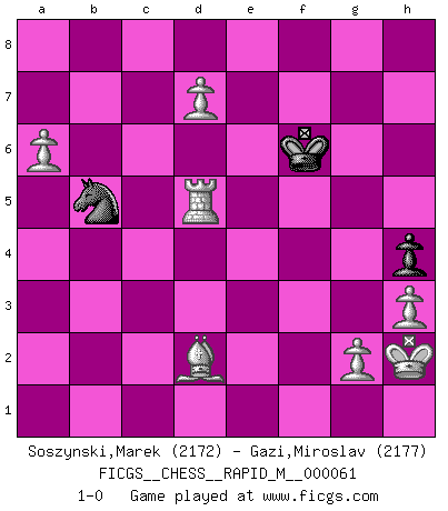 Last move : 1-0 2013 May 25 9:15:14 [Event "FICGS__CHESS__RAPID_M__000061"] [Site "FICGS"] [Date "2013.01.09"] [Round "1"] [White "Soszynski,Marek"] [Black "Gazi,Miroslav"] [Result "1-0"] [WhiteElo "2172"] [BlackElo "2177"] 1.d4 Nf6 2.c4 e6 3.Nc3 Bb4 4.Qc2 O-O 5.a3 Bxc3+ 6.Qxc3 b6 7.Bg5 h6 8.Bh4 Bb7 9.f3 d5 10.e3 Re8 11.Nh3 Nbd7 12.cxd5 exd5 13.Be2 g5 14.Bf2 c5 15.O-O Rc8 16.Qd2 c4 17.Bd1 Qe7 18.Kh1 Nf8 19.Ng1 Qd7 20.Ne2 Re7 21.Bc2 Ng6 22.Nc3 Rce8 23.Kg1 a6 24.a4 Kg7 25.Rfe1 h5 26.b3 cxb3 27.Bd1 h4 28.Rb1 Rc8 29.Rxb3 Re6 30.Be2 Qc7 31.Reb1 Rc6 32.Be1 Re8 33.Bd3 Qd8 34.a5 b5 35.Nxb5 axb5 36.Bxb5 Qd7 37.Ba4 Ba8 38.h3 Rec8 39.Bxc6 Bxc6 40.Rc1 Ne7 41.a6 Nh5 42.f4 f6 43.fxg5 fxg5 44.e4 Kg6 45.e5 Qa7 46.Qb4 Nf4 47.Kh2 Ne2 48.Qd6+ Kh5 49.Bd2 Ng6 50.Rxc6 Rxc6 51.Rb7 Rxd6 52.exd6 Nxd4 53.Rxa7 Ne5 54.Rg7 Nb5 55.Rxg5+ Kh6 56.Rxe5 Kg6 57.d7 Kf6 58.Rxd5 1-0 Nimzo-Indian : Classical variation Kingside Castling by player Black (move 4) Kingside Castling by player White (move 15) 10 pieces endgame at move 58 : White KRBPPPP , Black KNP WHITE : King + 1 Rook 1 Bishop 4 Pawns BLACK : King + 1 Knight 1 Pawn Player White won this chess game. Follow this game move after move (download)When you play Bobby, it is not a question if you win or lose. It is a question if you survive. (Boris Spassky) Der Freibauer hat für mich eine Seele, genau wie der Mensch, Wünsche, die unerkannt in ihm schlummern, und Befürchtungen, von deren Existenz er selbst kaum ahnt. (Aaron Nimzowitsch) Es el objetivo de la escuela moderna no tratar cada posición de acuerdo a una regla general, sino de acuerdo al principio inherente en la posición. (Richard Reti) Il n'y a plus de joueurs du niveau de Jacob Murray dont la seule quête est le beau jeu, le plaisir de voir les pièces construire quelque chose. Sur 10 idées à la minute, 9 seront sans intérêt, la dernière s'avèrera géniale. (Christian Bauer) Before all elsed, be armed. (Niccolo Machiavelli)