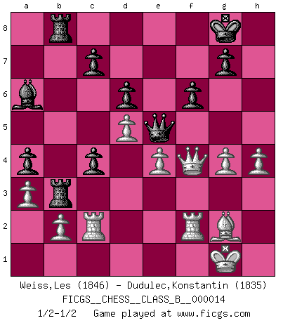 Last move : 1/2-1/2 2007 June 15 2:38:15 [Event "FICGS__CHESS__CLASS_B__000014"] [Site "FICGS"] [Date "2007.01.23"] [Round "1"] [White "Weiss,Les"] [Black "Dudulec,Konstantin"] [Result "1/2-1/2"] [WhiteElo "1846"] [BlackElo "1835"] 1.d4 Nf6 2.c4 e6 3.Nf3 Bb4+ 4.Bd2 Qe7 5.g3 Nc6 6.Bg2 Bxd2+ 7.Nbxd2 d6 8.O-O a5 9.e4 e5 10.d5 Nb8 11.Ne1 h5 12.h3 h4 13.g4 Nfd7 14.Nd3 Na6 15.a3 Nac5 16.Nxc5 Nxc5 17.Nb3 Nxb3 18.Qxb3 O-O 19.Qe3 a4 20.f4 exf4 21.Qxf4 Bd7 22.Rae1 f6 23.Qf2 b5 24.Rc1 bxc4 25.Qxh4 Rab8 26.Rf2 Bb5 27.Qg3 Ba6 28.Qf4 Rb3 29.h4 Rfb8 30.R1c2 Qe5 1/2-1/2 Bogo-Indian defense, Nimzovich variation Kingside Castling by player White (move 8) Kingside Castling by player Black (move 18) This chess game ended in a draw. Follow this game move after move (download)There must have been a time when men were demigods, or they could not have invented Chess. (Gustav Schenk) Kann Schach nicht schließlich das Nationalspiel der Deutschen werden? Und welche weiteren Ausblicke bieten sich dann dar! Welche Hebung des allgemeinen Kultur-Niveaus, ja der Moral, wenn das Schachbrett den Kartentisch verdrängen würde! Wahrlich, ein Ziel, des Schweißes der Edlen wert! (Siegbert Tarrasch) Aquellos que dicen entender al Ajedrez, no entienden nada. (Robert Hubner) La solitude du joueur d'Echecs à l'approche du mat est semblable à celle du condamné. (Francis Szpiner) Programming can only do so much before it becomes too much. (Don Groves)