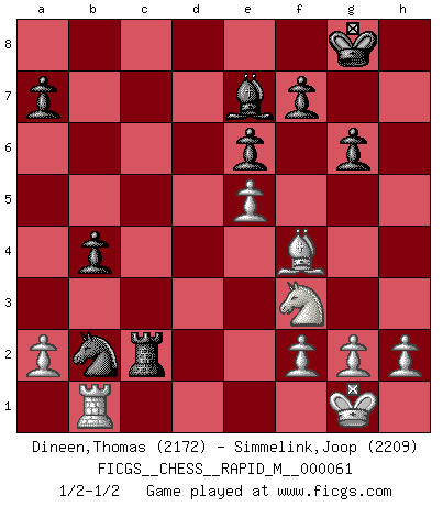 Last move : 1/2-1/2 2013 January 28 1:30:34 [Event "FICGS__CHESS__RAPID_M__000061"] [Site "FICGS"] [Date "2013.01.09"] [Round "1"] [White "Dineen,Thomas"] [Black "Simmelink,Joop"] [Result "1/2-1/2"] [WhiteElo "2172"] [BlackElo "2209"] 1.d4 d5 2.c4 c6 3.Nc3 Nf6 4.e3 e6 5.Bd3 Nbd7 6.Nf3 dxc4 7.Bxc4 b5 8.Bd3 Bb7 9.e4 b4 10.Na4 c5 11.e5 Nd5 12.O-O Rc8 13.dxc5 Nxc5 14.Nxc5 Bxc5 15.Ng5 Be7 16.Nxh7 g6 17.Bb5+ Bc6 18.Bxc6+ Rxc6 19.Qa4 Qc7 20.Ng5 Nb6 21.Qb5 O-O 22.Nf3 Rc8 23.Bf4 Rc2 24.Rab1 Qc4 25.Qxc4 Nxc4 26.Rfc1 Nxb2 27.Rxc2 Rxc2 1/2-1/2 QGD Slav defense Kingside Castling by player White (move 12) Kingside Castling by player Black (move 21) This chess game ended in a draw. Follow this game move after move (download)By playing at Chess then, we may learn: First: Foresight... Second: Circumspection... Third: Caution... And lastly, we learn by Chess the habit of not being discouraged by present bad appearances in the state of our affairs, the habit of hoping for a favorable chance, and that of persevering in the secrets of resources. (Benjamin Franklin) Karpov ist ein Museumsstück. (Garry Kasparov) Cuando me preguntan: -¿Cual es el secreto que te hace hacer mejores movidas que tus oponentes?, Yo respondo: Me da gusto que me pregunten eso, porque, como veran, hay una simple razón. Yo pienso mis propias movidas y dejo a mi oponente que el piense las suyas. (Alexander Alekhine) Les ravages du H expliquent la différence de niveau entre Tal et Thal [Abergel]. Everybody lies. (Gregory House, House M.D.)