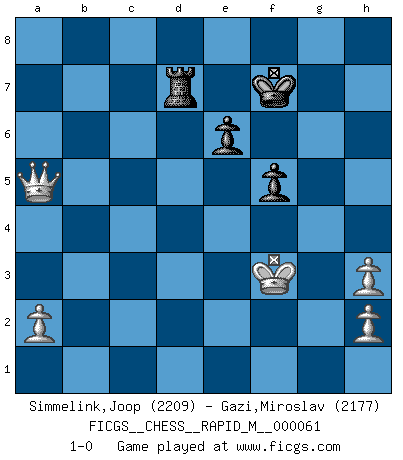 Last move : 1-0 2013 May 2 11:3:20 [Event "FICGS__CHESS__RAPID_M__000061"] [Site "FICGS"] [Date "2013.01.09"] [Round "1"] [White "Simmelink,Joop"] [Black "Gazi,Miroslav"] [Result "1-0"] [WhiteElo "2209"] [BlackElo "2177"] 1.e4 c5 2.Nf3 d6 3.d4 cxd4 4.Nxd4 Nf6 5.Nc3 a6 6.Bg5 e6 7.f4 Qb6 8.Qd2 Qxb2 9.Rb1 Qa3 10.e5 h6 11.Bh4 dxe5 12.fxe5 g5 13.exf6 gxh4 14.Be2 Qa5 15.O-O Nd7 16.Kh1 Qg5 17.Qe1 h3 18.gxh3 Qe5 19.Qf2 h5 20.Rfe1 Qxf6 21.Bf3 Be7 22.Ne4 Qe5 23.Rbd1 h4 24.c4 Rb8 25.c5 Nxc5 26.Nc6 bxc6 27.Nd6+ Qxd6 28.Rxd6 Bxd6 29.Qd4 Ke7 30.Qxh8 Nd3 31.Qxh4+ Kd7 32.Rd1 Rb4 33.Bg4 Ne5 34.Rxd6+ Kxd6 35.Qd8+ Nd7 36.Qxc8 a5 37.Bf3 c5 38.Qc6+ Ke7 39.Qc7 Rd4 40.Bc6 f5 41.Bxd7 Rd1+ 42.Kg2 Rd2+ 43.Kf3 Rxd7 44.Qxc5+ Kf7 45.Qxa5 1-0 Sicilian : Najdorf, 7...Qb6 Kingside Castling by player White (move 15) 10 pieces endgame at move 44 : White KQPPP , Black KRPPP WHITE : King + 1 Queen 3 Pawns BLACK : King + 1 Rook 3 Pawns 9 pieces endgame at move 45 : White KQPPP , Black KRPP WHITE : King + 1 Queen 3 Pawns BLACK : King + 1 Rook 2 Pawns Player White won this chess game. Follow this game move after move (download)War is the child of passion, passion is the child of narcissism and narcissism is the child. (...) Another game ? (Thibault de Vassal) Ich habe die besten Aussichten, den ersten Preis zu gewinnen - denn jeder muss gegen Steinitz spielen, nur ich nicht! (Wilhelm Steinitz) No soy una persona materialista y por eso, no resiento la falta o pérdida del dinero. La ausencia de cosas mundanas carece de importancia. Ya que el Ajedrez es una forma en la que puedo ser tan materialista como yo desee sin tener la necesidad de vender mi alma. (Jamie Walter Adams) Les échecs sont utiles à l'exercice de la faculté de penser et à celle de l'imagination. Car nous devons posséder une méthode élaborée pour atteindre des buts partout où nous devons conduire notre raison. (Leibnitz) Waiting for chance ? Play in casinos. (FICGS proverb)