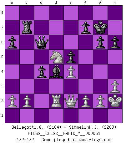 Last move : 1/2-1/2 2013 January 26 22:57:14 [Event "FICGS__CHESS__RAPID_M__000061"] [Site "FICGS"] [Date "2013.01.09"] [Round "1"] [White "Bellegotti,Giorgio"] [Black "Simmelink,Joop"] [Result "1/2-1/2"] [WhiteElo "2164"] [BlackElo "2209"] 1.d4 d5 2.c4 c6 3.Nf3 Nf6 4.Nc3 e6 5.Bg5 h6 6.Bxf6 Qxf6 7.e3 Nd7 8.Bd3 dxc4 9.Bxc4 g6 10.O-O Bg7 11.Re1 O-O 12.e4 e5 13.d5 Rd8 14.h3 b5 15.dxc6 bxc4 16.cxd7 Rxd7 17.Qc2 Qa6 18.Red1 Rxd1+ 19.Rxd1 Be6 20.Nh2 Rb8 21.Ng4 Kh7 22.Ne3 Bf8 23.Ned5 Qc6 24.Rd2 Bc5 25.Qd1 a6 26.Kh2 Kg7 27.Qf3 Bxd5 28.Nxd5 Bd4 29.Qe2 Rb7 1/2-1/2 QGD Slav : 4.Nc3 Kingside Castling by player White (move 10) Kingside Castling by player Black (move 11) This chess game ended in a draw. Follow this game move after move (download)Fischer prefers to enter Chess history alone. (Miguel Najdorf) Ohne Fehler kann es keine Brillanz geben. (Emanuel Lasker) El muchacho (en ese entonces un niño de 12 años llamado Anatoly Karpov) no tiene ni idea de lo que es el Ajedrez y no hay futuro en absoluto para el en esta profesión. (Mikhail Botvinnik) Avant la finale, les dieux ont créé le milieu de partie. (Tarrasch) Logic : The art of thinking and reasoning in strict accordance with the limitations and incapacities of the human misunderstanding. (Ambrose Bierce)