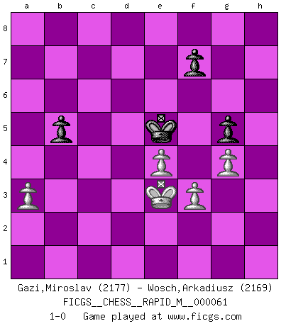 Last move : 1-0 2013 July 1 1:38:56 [Event "FICGS__CHESS__RAPID_M__000061"] [Site "FICGS"] [Date "2013.01.09"] [Round "1"] [White "Gazi,Miroslav"] [Black "Wosch,Arkadiusz"] [Result "1-0"] [WhiteElo "2177"] [BlackElo "2169"] 1.d4 Nf6 2.Bg5 Ne4 3.Bf4 c5 4.f3 Qa5+ 5.c3 Nf6 6.Nd2 cxd4 7.Nb3 Qb6 8.Qxd4 Nc6 9.Qxb6 axb6 10.Nd4 e5 11.Nxc6 exf4 12.Nd4 d5 13.g3 Bd6 14.Kf2 Bd7 15.Nh3 fxg3+ 16.hxg3 h5 17.e3 h4 18.g4 Bg3+ 19.Kg2 O-O-O 20.Ng1 Rde8 21.Nge2 Bb8 22.Nc2 g5 23.Ned4 Be5 24.Bd3 Kc7 25.Nb5+ Kb8 26.Nbd4 Kc7 27.Rae1 h3+ 28.Rxh3 Rxh3 29.Kxh3 Rh8+ 30.Kg2 Rh2+ 31.Kf1 Rd2 32.Nb4 Rxb2 33.Bc2 Bc6 34.Nd3 Bxd4 35.Nxb2 Bxc3 36.Rb1 d4 37.Ke2 Nd5 38.e4 Bb5+ 39.Kf2 Nf4 40.Nd1 d3 41.Nxc3 dxc2 42.Nxb5+ Kd7 43.Ra1 c1Q 44.Rxc1 Nd3+ 45.Ke3 Nxc1 46.Nc3 b5 47.Kd2 b4 48.Kxc1 bxc3 49.Kc2 Ke6 50.Kxc3 Ke5 51.Kd3 Kf4 52.Ke2 b5 53.a3 Ke5 54.Ke3 1-0 Trompowsky attack (Ruth, Opovcensky Opening) Queenside Castling by player Black (move 19) Promotion Queen by player Black (move 43) 10 pieces endgame at move 48 : White KPPPP , Black KPPPP WHITE : King + 4 Pawns BLACK : King + 4 Pawns 9 pieces endgame at move 50 : White KPPPP , Black KPPP WHITE : King + 4 Pawns BLACK : King + 3 Pawns Player White won this chess game. Follow this game move after move (download)Chess is a fairy tale of 1001 blunders. (Savielly Tartakower) Wie gewinnt Tal? Er entwickelt alle seine Figuren in die Brettmitte und opfert sie dann irgendwo. (Robert James Fischer) No es suficiente ser un buen jugador, se debe también de jugar bién. (Siegbert Tarrasch) Le thème de l'attaque double intervient d'une manière ou d'une autre dans l'immense majorité des combinaisons. (Youri Averbakh) The beginning is the most important part of the work. (Plato)