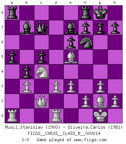 Last move : 1-0 2007 March 1 23:49:14 [Event "FICGS__CHESS__CLASS_B__000014"] [Site "FICGS"] [Date "2007.01.23"] [Round "1"] [White "Musil,Stanislav"] [Black "Oliveira,Carlos"] [Result "1-0"] [WhiteElo "1900"] [BlackElo "1981"] 1.Nf3 c6 2.c4 d5 3.g3 dxc4 4.Bg2 Nf6 5.Qc2 b5 6.b3 cxb3 7.axb3 Bb7 8.Ba3 a5 9.O-O b4 10.Bb2 e6 11.d3 Be7 12.Nbd2 O-O 13.Nc4 c5 14.Rfd1 Nc6 15.e3 Qc7 16.Nfe5 Nxe5 17.Bxe5 1-0 Reti Opening Kingside Castling by player White (move 9) Kingside Castling by player Black (move 12) Player White won this chess game. Follow this game move after move (download)I love all positions. Give me a difficult positional game, I will play it. But totally won positions, I cannot stand them. (Hein Donner) Sehr viele beherrschen heutzutage das große Einmalseins des Schachspiels und kennen sogar dessen Logarithmentafeln auswendig - deshalb sollte man hin und wieder zu beweisen trachten, dass zwei mal zwei auch fünf sein kann. (Mikhail Nekhemyevich Tal) El sobresalir en el Ajedrez es un signo de una mente intrigante. (Sir Arthur Conan Doyle) D'abord les bases : Jouez et étudiez, puis étudiez et jouez, ensuite jouez et étudiez, puis étudiez et jouez. Deuxièmement : Donnez toujours le meilleur de vous-même ! (Ken Smith) When you don't know what to do, walk fast and look worried. (Anonymous)