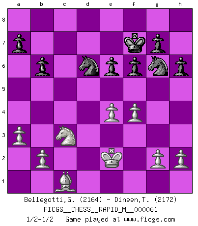 Last move : 1/2-1/2 2013 February 8 18:21:30 [Event "FICGS__CHESS__RAPID_M__000061"] [Site "FICGS"] [Date "2013.01.09"] [Round "1"] [White "Bellegotti,Giorgio"] [Black "Dineen,Thomas"] [Result "1/2-1/2"] [WhiteElo "2164"] [BlackElo "2172"] 1.d4 Nf6 2.c4 e6 3.Nc3 Bb4 4.Qc2 O-O 5.a3 Bxc3+ 6.Qxc3 b6 7.Bg5 Bb7 8.f3 h6 9.Bh4 d5 10.e3 Nbd7 11.cxd5 Nxd5 12.Bxd8 Nxc3 13.Bh4 Nd5 14.Bf2 c5 15.e4 Nf4 16.Be3 Ng6 17.Ne2 Ba6 18.Kf2 Rac8 19.Rd1 Rfd8 20.Nc3 Bxf1 21.Rhxf1 cxd4 22.Rxd4 Nde5 23.Rxd8+ Rxd8 24.Rd1 Rxd1 25.Nxd1 Nc4 26.Bc1 f6 27.Nc3 Nd6 28.f4 Kf7 29.Ke2 1/2-1/2 Nimzo-Indian : Classical variation Kingside Castling by player Black (move 4) This chess game ended in a draw. Follow this game move after move (download)When I have White, I win because I am white; When I have Black, I win because I am Bogolyubov. (Bogolyubov) Schach sollte überall auf der Welt Schulfach werden. Es fördert die geistige Auseinandersetzung. Es lehrt die Demut in der Niederlage. (Garry Kasparov) Yo jugué Ajedrez con el y a veces le pude haber ganado solo que siempre devuelve su última jugada y juega la partida de manera diferente. (Mark Twain) Vouloir jouer aux échecs contre soi-même est aussi paradoxal que vouloir marcher sur son ombre. (Stefan Zweig) Think like a man of action, act like a man of thought. (Henri Louis Bergson)