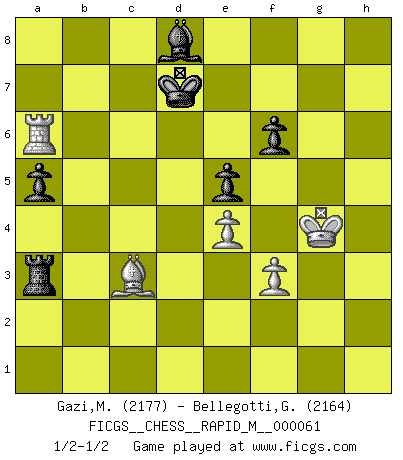 Last move : 1/2-1/2 2013 May 21 19:57:26 [Event "FICGS__CHESS__RAPID_M__000061"] [Site "FICGS"] [Date "2013.01.09"] [Round "1"] [White "Gazi,Miroslav"] [Black "Bellegotti,Giorgio"] [Result "1/2-1/2"] [WhiteElo "2177"] [BlackElo "2164"] 1.d4 Nf6 2.Bg5 d5 3.Nd2 c5 4.dxc5 e6 5.Nb3 Nbd7 6.e3 Nxc5 7.Nxc5 Bxc5 8.Bb5+ Kf8 9.Bd3 e5 10.c3 h6 11.Bh4 Be6 12.Ne2 g6 13.Qd2 Kg7 14.Rd1 Qb6 15.O-O Rac8 16.h3 Ne4 17.Bxe4 dxe4 18.b3 f6 19.c4 g5 20.Bg3 Rhd8 21.Qc2 Qc6 22.Nc3 Bf5 23.Nd5 b5 24.Qb2 bxc4 25.bxc4 Kg6 26.h4 Qa6 27.Qb3 Kg7 28.Nc7 Qc6 29.Rxd8 Rxd8 30.Nd5 Be6 31.Rc1 Bxd5 32.cxd5 Qxd5 33.Qc4 Qxc4 34.Rxc4 Rd1+ 35.Kh2 Bd6 36.hxg5 hxg5 37.Rxe4 a5 38.Rc4 Rd3 39.e4 Rd2 40.a4 Rd4 41.Rc6 Be7 42.f3 Rxa4 43.Rc7 Kf7 44.Be1 Ra1 45.Bd2 Ke6 46.Ra7 Bd8 47.Ra6+ Kd7 48.Kh3 Ra2 49.Bc3 g4+ 50.Kxg4 Rxg2+ 51.Kh3 Ra2 52.Kg4 Ra3 1/2-1/2 Trompowsky attack (Ruth, Opovcensky Opening) Kingside Castling by player White (move 15) This chess game ended in a draw. Follow this game move after move (download)Chess is like life. (Boris Spassky) Warum muß ich gegen diesen IDIOTEN verlieren? (Aaron Nimzowitsch) Si tu oponente te ofrece un empate, trata de averiguar porque piensa él que esta en una posición peor. (Nigel Short) J'ai toujours senti une vague pitié pour l'homme qui ne connaît rien aux échecs, tout comme j'en aurais pour un homme ignorant de l'amour. Les Echecs, comme la musique ou comme l'amour, ont le pouvoir de rendre heureux. (Siegbert Tarrasch) Life is like a play: it's not the length but the excellence of the acting that matters. (Seneca)