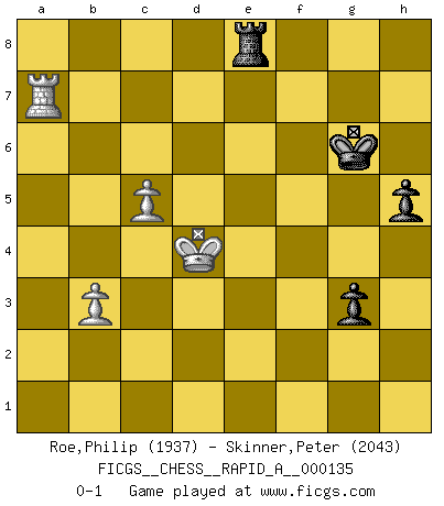 Last move : 0-1 2013 April 7 23:37:13 [Event "FICGS__CHESS__RAPID_A__000135"] [Site "FICGS"] [Date "2013.01.09"] [Round "1"] [White "Roe,Philip"] [Black "Skinner,Peter"] [Result "0-1"] [WhiteElo "1937"] [BlackElo "2043"] 1.Nc3 c5 2.g4 d5 3.Bg2 e6 4.d3 Nc6 5.Bf4 e5 6.Bg3 d4 7.Bxc6+ bxc6 8.Ne4 Bxg4 9.Bxe5 Qd5 10.Bf4 Be7 11.f3 Bc8 12.c4 Qe6 13.Qd2 Nh6 14.Ng3 Nf5 15.Nxf5 Qxf5 16.O-O-O O-O 17.e4 dxe3 18.Qxe3 Re8 19.Ne2 Qh3 20.Ng3 Bf5 21.Nxf5 Qxf5 22.Rhe1 Bf8 23.Qd2 f6 24.h4 h6 25.b3 g5 26.hxg5 fxg5 27.Bc7 Qf6 28.f4 Qa1+ 29.Kc2 Qxa2+ 30.Kc3 Bg7+ 31.Be5 Qa5+ 32.Kc2 Qxd2+ 33.Kxd2 Bxe5 34.fxe5 Re6 35.Kc3 Rae8 36.d4 cxd4+ 37.Rxd4 Rxe5 38.Rxe5 Rxe5 39.Rd6 Kh7 40.Rxc6 g4 41.Ra6 g3 42.Rxa7+ Kg6 43.Kd4 Re8 44.c5 h5 0-1 Dunst (Sleipner, Heinrichsen) Opening Queenside Castling by player White (move 16) Kingside Castling by player Black (move 16) 10 pieces endgame at move 38 : White KRPP , Black KRPPPP WHITE : King + 1 Rook 2 Pawns BLACK : King + 1 Rook 4 Pawns 9 pieces endgame at move 40 : White KRPP , Black KRPPP WHITE : King + 1 Rook 2 Pawns BLACK : King + 1 Rook 3 Pawns 8 pieces endgame at move 42 : White KRPP , Black KRPP WHITE : King + 1 Rook 2 Pawns BLACK : King + 1 Rook 2 Pawns Player Black won this chess game. Follow this game move after move (download)Later, I began to succeed in decisive games. Perhaps because I realized a very simple truth: not only was I worried, but also my opponent. (Mikhail Tal) Stil? Ich habe keinen Stil! (Anatoly Karpov) El Ajedrez tiene tanto misterio como las mujeres. (Purdy) Si rien de grave n'est détecté lors de l'analyse d'une position, on joue alors le coup. Seconde règle de Blumenfeld. Is not life a hundred times too short to bore ourselves ? (Friedrich Nietzsche)
