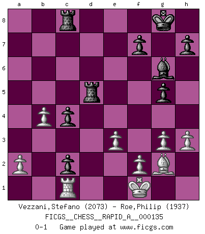 Last move : 0-1 2013 April 23 9:6:53 [Event "FICGS__CHESS__RAPID_A__000135"] [Site "FICGS"] [Date "2013.01.09"] [Round "1"] [White "Vezzani,Stefano"] [Black "Roe,Philip"] [Result "0-1"] [WhiteElo "2073"] [BlackElo "1937"] 1.b3 e5 2.Bb2 Nc6 3.e3 Nf6 4.g3 d5 5.Bg2 Be6 6.d3 Bd6 7.Ne2 Qd7 8.h3 O-O 9.Nd2 Ne7 10.c4 c6 11.c5 Bc7 12.Qc2 b6 13.Nf3 e4 14.Ne5 Bxe5 15.Bxe5 exd3 16.Qxd3 Bf5 17.Qd4 bxc5 18.Qxc5 Ne4 19.Qa5 c5 20.Qc7 Qxc7 21.Bxc7 Rac8 22.Bf4 g5 23.Be5 Nc6 24.Bb2 c4 25.O-O Nb4 26.Ba3 a5 27.Rfd1 Bg6 28.Bxb4 axb4 29.Rxd5 Nc3 30.Nxc3 bxc3 31.b4 c2 32.Rc1 Rfd8 33.Kf1 Rxd5 0-1 This chess game has been lost on time (started : 2013.01.09 13:26:18) Nimzovich-Larsen attack : Modern variation Kingside Castling by player Black (move 8) Kingside Castling by player White (move 25) Player Black won this chess game. Follow this game move after move (download)I like the moment when I break a man's ego. (Bobby Fischer) Der Partner hat auch seine Existenzberechtigung. (Savielly Grigorievitsch Tartakower) Mi estilo es algo parecido entre un poco de Tal y Petrosian. (Reshevsky) Je menace de comprendre la position. (Anonyme) Perhaps chess is the wrong game for the times (The Chess Master and the Computer, by Garry Kasparov - 2010)