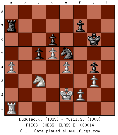 Last move : 0-1 2007 October 31 11:27:35 [Event "FICGS__CHESS__CLASS_B__000014"] [Site "FICGS"] [Date "2007.01.23"] [Round "1"] [White "Dudulec,Konstantin"] [Black "Musil,Stanislav"] [Result "0-1"] [WhiteElo "1835"] [BlackElo "1900"] 1.d4 Nf6 2.c4 c5 3.d5 e6 4.Nc3 exd5 5.cxd5 d6 6.e4 g6 7.Nf3 Bg7 8.Be2 O-O 9.O-O Re8 10.Nd2 Nbd7 11.h3 a6 12.a4 b6 13.Qc2 Qe7 14.Re1 Rb8 15.Nc4 Ne5 16.Bg5 h6 17.Bf4 Nxc4 18.Bxc4 Nh5 19.Bh2 Be5 20.Bxe5 Qxe5 21.Re3 Bd7 22.Bxa6 Nf4 23.Bb5 Bxb5 24.Nxb5 Qe7 25.Rae1 Rbd8 26.Qc3 Qg5 27.Rg3 Qe5 28.Qxe5 Rxe5 29.Rge3 Re7 30.h4 g5 31.hxg5 hxg5 32.b4 Kf8 33.bxc5 bxc5 34.g3 Ng6 35.Kg2 g4 36.Rb3 Rb8 37.R3b1 Reb7 38.Nc3 Ne5 39.Rxb7 Rxb7 40.Rb1 Ra7 41.Kf1 Ke7 42.Ke2 Kf6 43.Ra1 Kg6 0-1 Benoni : Classical with e4 and Nf3 Kingside Castling by player Black (move 8) Kingside Castling by player White (move 9) Player Black won this chess game. Follow this game move after move (download)Methodical thinking is of more use in Chess than inspiration. (C. J. S. Purdy) Nur ein wirklich starker Spieler weiß wie schwach er spielt. (Savielly Grigorievitsch Tartakower) Todos los jugadores de Ajedrez deberían tener un pasatiempo. (Savielly Tartakower) Les Echecs sont et restent toujours un combat, un combat intégral comme la boxe, la lutte ou un autre sport, et où il doit y avoir un vainqueur et un vaincu. (Joseph Emil Diemer) Inventor: A person who makes an ingenious arrangement of wheels, levers and springs, and believes it civilization. (Ambrose Bierce, The Devil's Dictionary)