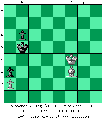 Last move : 1-0 2013 January 20 21:24:4 [Event "FICGS__CHESS__RAPID_A__000135"] [Site "FICGS"] [Date "2013.01.09"] [Round "1"] [White "Palamarchuk,Oleg"] [Black "Riha,Josef"] [Result "1-0"] [WhiteElo "2054"] [BlackElo "1961"] 1.Nf3 d5 2.d4 Nf6 3.c4 c6 4.e3 Bf5 5.Nc3 e6 6.Nh4 Be4 7.f3 Bg6 8.Qb3 Qb6 9.Nxg6 hxg6 10.Bd2 Nbd7 11.Kf2 Qc7 12.g3 Bd6 13.cxd5 exd5 14.Kg2 Nf8 15.e4 Ne6 16.Be3 Bxg3 17.hxg3 Rxh1 18.Kxh1 Qxg3 19.Bg2 dxe4 20.Ne2 Qh4+ 21.Kg1 exf3 22.Bf2 Qg5 23.Qxf3 O-O-O 24.Rf1 Nd5 25.Qe4 Qf5 26.Nc3 Qxe4 27.Bxe4 Nf6 28.d5 cxd5 29.Bf3 b6 30.Rd1 g5 31.Nxd5 Nxd5 32.Rxd5 Rxd5 33.Bxd5 Kd7 34.Bg3 f6 35.Kf2 Nf4 36.Be4 Ke6 37.Kf3 f5 38.Bb7 Ke5 39.b4 Kf6 40.Bxf4 gxf4 41.Kxf4 a5 42.b5 g5+ 43.Ke3 Ke5 44.Bf3 a4 45.Bd1 a3 46.Bf3 Kf6 47.Kd4 Ke6 48.Bb7 g4 49.Bc8+ Kf6 50.Ke3 Ke5 51.Bd7 f4+ 52.Kd3 g3 53.Bc6 Ke6 54.Bg2 Ke5 55.Bf3 Kf5 56.Kd4 Ke6 57.Ke4 Kd6 58.Kxf4 Kc5 59.Kxg3 Kxb5 60.Kf4 1-0 Reti Opening Queenside Castling by player Black (move 23) 10 pieces endgame at move 40 : White KBPP , Black KPPPPP WHITE : King + 1 Bishop 2 Pawns BLACK : King + 5 Pawns 9 pieces endgame at move 41 : White KBPP , Black KPPPP WHITE : King + 1 Bishop 2 Pawns BLACK : King + 4 Pawns 8 pieces endgame at move 58 : White KBPP , Black KPPP WHITE : King + 1 Bishop 2 Pawns BLACK : King + 3 Pawns 7 pieces endgame at move 59 : White KBPP , Black KPP WHITE : King + 1 Bishop 2 Pawns BLACK : King + 2 Pawns 6 pieces endgame at move 59 : White KBP , Black KPP WHITE : King + 1 Bishop 1 Pawn BLACK : King + 2 Pawns Player White won this chess game. Follow this game move after move (download)Chess teaches you to control the initial excitement you feel when you see something that looks good and it trains you to think objectively when you're in trouble. (Stanley Kubrick) Ich habe die Schachforschung dermaßen betrieben, dass sie auf eine wissenschaftliche Basis gestellt wurde. (Mikhail Moiseyevich Botvinik) El ganador de una partida es aquel jugador que hace el penúltimo error. (Savielly Tartakover) J'ai vu le vaincu d'Echecs jouer des années durant dans l'espoir de la fête de la victoire. Car tu es plus riche de ce qu'elle existe si même elle n'est point pour toi. Ainsi de la perle du fond des mers. (Antoine de Saint-Exupéry) The absolute truth is the thing that makes people laugh. (Carl Reiner)