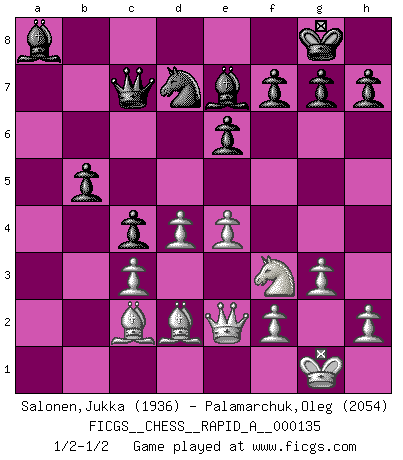 Last move : 1/2-1/2 2013 January 17 12:10:14 [Event "FICGS__CHESS__RAPID_A__000135"] [Site "FICGS"] [Date "2013.01.09"] [Round "1"] [White "Salonen,Jukka"] [Black "Palamarchuk,Oleg"] [Result "1/2-1/2"] [WhiteElo "1936"] [BlackElo "2054"] 1.d4 Nf6 2.c4 e6 3.Nf3 b6 4.Nc3 Bb7 5.a3 d5 6.cxd5 Nxd5 7.Qc2 Nxc3 8.bxc3 Nd7 9.e4 c5 10.Bd3 Qc7 11.Qb1 Be7 12.O-O O-O 13.Qa2 b5 14.Qe2 a6 15.a4 Nb6 16.axb5 c4 17.Bc2 axb5 18.Be3 Nd7 19.g3 Rxa1 20.Rxa1 Ra8 21.Rxa8+ Bxa8 22.Bd2 1/2-1/2 Queen's Indian : 4.Nc3 Kingside Castling by player White (move 12) Kingside Castling by player Black (move 12) This chess game ended in a draw. Follow this game move after move (download)Chess is war over the board. The object is to crush the opponents mind. (Bobby Fischer) Die Idee von Capablanca, Schach als Fach in den Schulen zu lehren, ist großartig. (Fidel Castro) Haz el enroque temprano y seguido. (Rob Sillars) A ce moment-là, je menaçais de comprendre la position ! (Clément L'Heureux) Knowledge will give you power, but character respect. (Bruce Lee)