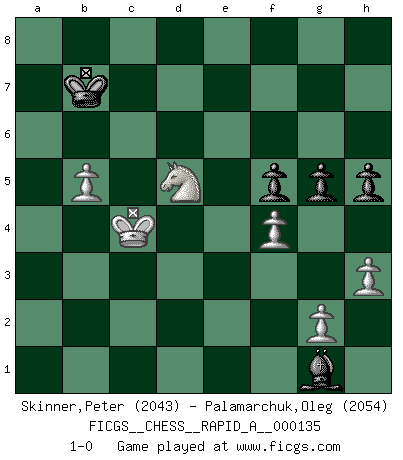 Last move : 1-0 2013 June 3 5:28:38 [Event "FICGS__CHESS__RAPID_A__000135"] [Site "FICGS"] [Date "2013.01.09"] [Round "1"] [White "Skinner,Peter"] [Black "Palamarchuk,Oleg"] [Result "1-0"] [WhiteElo "2043"] [BlackElo "2054"] 1.e4 e5 2.Nf3 Nc6 3.Bb5 a6 4.Ba4 Nf6 5.O-O Be7 6.Re1 b5 7.Bb3 O-O 8.d3 d6 9.c3 Na5 10.Bc2 c5 11.Nbd2 Nc6 12.h3 Be6 13.d4 cxd4 14.cxd4 exd4 15.Nb3 Bxb3 16.Bxb3 Qb6 17.Bf4 Nd7 18.Bd5 Nde5 19.Bxe5 dxe5 20.Bxc6 Qxc6 21.Nxe5 Qe6 22.Nd3 Rac8 23.e5 Rfd8 24.a4 b4 25.Rc1 Rxc1 26.Qxc1 h6 27.Qc7 Bg5 28.Qb7 a5 29.Qb5 Qf5 30.e6 Qxb5 31.axb5 Rb8 32.e7 Re8 33.b6 Rxe7 34.Rxe7 Bxe7 35.b7 Bd6 36.Nc5 Kf8 37.Kf1 Ke7 38.Ke2 a4 39.Nxa4 Kd7 40.Kd3 Kc7 41.Kxd4 Kxb7 42.Kd5 Kc7 43.Nc5 h5 44.b3 Bf8 45.Nd3 Kd7 46.Nf4 g6 47.Nd3 g5 48.Kc4 Bd6 49.Nxb4 Ke6 50.Na6 f5 51.b4 Bh2 52.Nc5+ Kd6 53.Nd3 Kc6 54.b5+ Kb6 55.Nb4 Kb7 56.Nd5 Bg1 57.f4 1-0 Ruy Lopez : Closed, 7...O-O Kingside Castling by player White (move 5) Kingside Castling by player Black (move 7) Player White won this chess game. Follow this game move after move (download)I have added these principles to the law: get the Knights into action before both Bishops are developed. (Emanuel Lasker) Heutzutage gewinnt im Turnier nicht derjenige Spieler, der weitreichende Pläne entwirft, sondern einfach jener, der Zug um Zug kämpft. (David Bronstein) La última cosa en que Fischer estaba interesado era en tonterías, siempre y cuando el Ajedrez estuviera involucrado. (Elie Agur) Echiquier : carré parfait, comme la Jérusalem nouvelle décrite par l'auteur de l'Apocalypse, huit cases sur huit, exaltation du chiffre 4, symbole du cosmos aux quatre horizons... où le noir et le blanc, l'ombre et la lumière, le mal et le bien s'entremêlent et se conjuguent. (Robert Couffignal, Le Gambit du poète) My poor ole parrot... Is not in the circulation of displays ....poo hoo hoo :) (Wayne Lowrance's enigma)