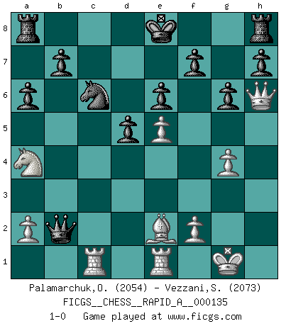 Last move : 1-0 2013 January 19 15:54:35 [Event "FICGS__CHESS__RAPID_A__000135"] [Site "FICGS"] [Date "2013.01.09"] [Round "1"] [White "Palamarchuk,Oleg"] [Black "Vezzani,Stefano"] [Result "1-0"] [WhiteElo "2054"] [BlackElo "2073"] 1.e4 g6 2.d4 Bg7 3.Nf3 c5 4.c3 cxd4 5.cxd4 d5 6.e5 Nh6 7.Bf4 Bg4 8.Qd2 Bxf3 9.Bxh6 Bxh6 10.Qxh6 Bg4 11.Nc3 a6 12.Bd3 Nc6 13.O-O e6 14.Rac1 Qb6 15.h3 Bh5 16.g4 Bxg4 17.hxg4 Qxd4 18.Be2 Qb4 19.Rfe1 Qxb2 20.Na4 1-0 Robatsch (Modern) defense Kingside Castling by player White (move 13) Player White won this chess game. Follow this game move after move (download)Look at Garry Kasparov. After he loses, invariably he wins the next game. He just kills the next guy. That's something that we have to learn to be able to do. (Maurice Ashley) Eine Person mit durchschnittlichem IQ kann etwa eine ELO von 2000 erreichen. (Jonathan Levitt) No es suficiente ser un buen jugador, se debe también de jugar bién. (Siegbert Tarrasch) Il n'y a pas eu de défaite parce que je ne crois pas que cet ordinateur ait jamais existé. IBM a triché en refusant d'imprimer les modes de recherche de la machine. C'est évident, pendant le match, des coups décisifs ont été joués par des êtres humains. Aujourd'hui, les meilleurs spécialistes en informatique ne peuvent toujours pas expliquer comment Deep-Blue a pu jouer contre la logique des ordinateurs. IBM a gagné une guerre de communication, mais ils sont incapables de prouver que l'ordinateur a gagné tout seul. (Garry Kasparov) If you are good, you will be assigned all the work. If you are really good, you will get out of it. (Dan Rotaru)