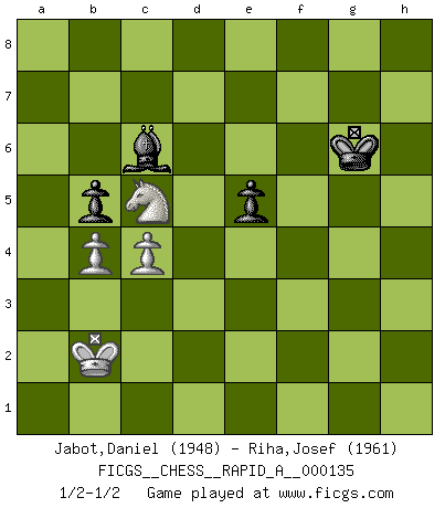 Last move : 1/2-1/2 2013 March 31 21:17:24 [Event "FICGS__CHESS__RAPID_A__000135"] [Site "FICGS"] [Date "2013.01.09"] [Round "1"] [White "Jabot,Daniel"] [Black "Riha,Josef"] [Result "1/2-1/2"] [WhiteElo "1948"] [BlackElo "1961"] 1.e4 c5 2.Nf3 d6 3.d4 cxd4 4.Nxd4 Nf6 5.Nc3 a6 6.Bg5 e6 7.f4 Qb6 8.Nb3 Be7 9.Qf3 Nbd7 10.Bd3 h6 11.Qh3 Nc5 12.O-O-O O-O 13.Bh4 Nxd3+ 14.Rxd3 Qc7 15.g4 d5 16.e5 Nh7 17.Bxe7 Qxe7 18.Kb1 f6 19.exf6 Nxf6 20.g5 Ne4 21.Qe3 hxg5 22.fxg5 Qxg5 23.Nxe4 Qxe3 24.Rxe3 dxe4 25.Rxe4 Rf2 26.Rd1 b5 27.Rd8+ Rf8 28.Rxf8+ Kxf8 29.Nc5 Ke7 30.Rg4 Kf6 31.Rd4 Ra7 32.Rd8 Rc7 33.b4 a5 34.a3 axb4 35.axb4 Bb7 36.Kb2 Bc6 37.h3 g5 38.Rh8 e5 39.h4 gxh4 40.Rxh4 Rg7 41.Rh6+ Rg6 42.Rxg6+ Kxg6 43.c4 1/2-1/2 Sicilian : Najdorf, 7...Qb6 Queenside Castling by player White (move 12) Kingside Castling by player Black (move 12) 10 pieces endgame at move 40 : White KRNPP , Black KRBPP WHITE : King + 1 Rook 1 Knight 2 Pawns BLACK : King + 1 Rook 1 Bishop 2 Pawns 9 pieces endgame at move 42 : White KRNPP , Black KBPP WHITE : King + 1 Rook 1 Knight 2 Pawns BLACK : King + 1 Bishop 2 Pawns 8 pieces endgame at move 42 : White KNPP , Black KBPP WHITE : King + 1 Knight 2 Pawns BLACK : King + 1 Bishop 2 Pawns This chess game ended in a draw. Follow this game move after move (download)A bad day of Chess is better than any good day at work. (Anonymous) Jeder Fehler erscheint unglaublich dumm, wenn andre ihn begehen. (Georg Christoph Lichtenberg) Tu eres para mi la Reina en d8 y yo soy el Peón en d7!!. (GM Eduard Gufeld) La guerre est enfant de la passion, la passion est enfant du narcissisme et le narcissisme est l'enfant. (...) Une autre partie ? (Thibault de Vassal) It's not enough to succeed. Others must fail. (Gore Vidal)
