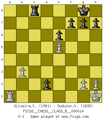 Last move : 0-1 2007 March 5 22:45:34 [Event "FICGS__CHESS__CLASS_B__000014"] [Site "FICGS"] [Date "2007.01.23"] [Round "1"] [White "Oliveira,Carlos"] [Black "Dudulec,Konstantin"] [Result "0-1"] [WhiteElo "1981"] [BlackElo "1835"] 1.e3 d5 2.b3 Nf6 3.Bb2 e6 4.f4 c5 5.Nf3 Be7 6.Bb5+ Bd7 7.Bxd7+ Nbxd7 8.O-O O-O 9.d3 b5 10.c4 bxc4 11.dxc4 dxc4 12.bxc4 Rb8 13.Qc2 Ng4 14.Qe2 Nxe3 15.Qxe3 Rxb2 16.Nc3 Nb6 17.Ne5 Qd4 18.Qxd4 cxd4 19.Nb5 Nxc4 20.Nxa7 Nxe5 21.fxe5 Bc5 22.Nc6 Rc8 23.Na5 d3 24.Kh1 Bd4 25.Nb3 Rxb3 26.axb3 Bxa1 27.Rxa1 d2 0-1 Van't Kruijs Opening Kingside Castling by player White (move 8) Kingside Castling by player Black (move 8) Player Black won this chess game. Follow this game move after move (download)A big shock; the best chess player in history has passed away. (Lajos Portisch, about Bobby Fischer's death) Karpov ist ein Museumsstück. (Garry Kasparov) El tablero es el mundo, las piezas es el fenomeno del universo, las reglas del juego son lo que llamamos leyes de la naturaleza y el jugador del lado opuesto, se encuentra oculto a nuestra vista. (Thomas Huxley) Les échecs, c'est la lutte contre l'erreur. (Johannes Zukertort) Shallow men believe in luck. Strong men belive in cause and effect. (Ralph Waldo Emerson)