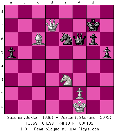 Last move : 1-0 2013 April 15 8:58:12 [Event "FICGS__CHESS__RAPID_A__000135"] [Site "FICGS"] [Date "2013.01.09"] [Round "1"] [White "Salonen,Jukka"] [Black "Vezzani,Stefano"] [Result "1-0"] [WhiteElo "1936"] [BlackElo "2073"] 1.e4 g6 2.d4 Bg7 3.Nf3 c5 4.d5 Nf6 5.Nc3 d6 6.Be2 O-O 7.O-O e6 8.Bf4 exd5 9.exd5 Bg4 10.h3 Bxf3 11.Bxf3 Na6 12.Nb5 Ne8 13.c3 Nac7 14.Na3 b5 15.Nc2 a5 16.Qd3 Rb8 17.Rfe1 Na8 18.Re2 b4 19.Rc1 Nec7 20.Ne3 Qf6 21.Bg3 Nb5 22.R2e1 Rfe8 23.Ng4 Rxe1+ 24.Rxe1 Qd8 25.Rc1 f5 26.Ne3 Nac7 27.Bf4 Be5 28.Bxe5 dxe5 29.Be2 bxc3 30.bxc3 Nd6 31.Rb1 e4 32.Rxb8 Qxb8 33.Qc2 Nce8 34.g3 Nf6 35.c4 Qb4 36.Qc1 Nd7 37.g4 Qb7 38.Ng2 Nf8 39.Qa3 Qb1+ 40.Bf1 Nxc4 41.Qc3 Nb6 42.Qxc5 Nbd7 43.Qc3 fxg4 44.hxg4 Qb4 45.Qc7 Qb2 46.Qc4 Nb6 47.Qxe4 Qxa2 48.Ne3 Qa3 49.g5 Qb4 50.Qe8 Qf4 51.Bh3 Qxg5+ 52.Kf1 Qf6 53.Be6+ Kh8 54.d6 h5 55.d7 Nbxd7 56.Bxd7 Kg7 57.Bc6 Ne6 58.Qd7+ 1-0 This chess game has been lost on time (started : 2013.01.09 13:26:18) Robatsch (Modern) defense Kingside Castling by player Black (move 6) Kingside Castling by player White (move 7) Player White won this chess game. Follow this game move after move (download)We don't really know how the game was invented, though there are suspicions. As soon as we discover the culprits, we'll let you know. (Bruce Pandolfini) Ich verstehe mehr vom Schach als irgendein anderer lebender Meister. (José Raúl Capablanca) Existen dos clases de sacrificios: los correctos y los míos. (Mikhail Tal) Le temps de noter son nom sur la feuille de partie, j'étais déjà en zeitnot ! D'un modeste amateur apparié lors de la première ronde d'un open contre le grand-maître Azmaïparashvili. Man is still the most extraordinary computer of all. (John F. Kennedy)