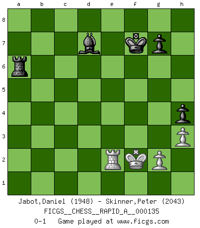 Last move : 0-1 2013 May 13 22:14:49 [Event "FICGS__CHESS__RAPID_A__000135"] [Site "FICGS"] [Date "2013.01.09"] [Round "1"] [White "Jabot,Daniel"] [Black "Skinner,Peter"] [Result "0-1"] [WhiteElo "1948"] [BlackElo "2043"] 1.e4 c5 2.Nf3 d6 3.d4 cxd4 4.Nxd4 Nf6 5.Nc3 a6 6.Bg5 e6 7.f4 Qb6 8.Qd2 Qxb2 9.Rb1 Qa3 10.f5 Nc6 11.Be2 Nxd4 12.Qxd4 Be7 13.O-O O-O 14.Rf3 Qa5 15.Rg3 Kh8 16.Kh1 Re8 17.fxe6 Bxe6 18.Rxb7 Nh5 19.Bxh5 Bxg5 20.Rf3 Bf6 21.Rxf6 Qxh5 22.Rf3 Qe5 23.Qxe5 dxe5 24.h3 Red8 25.a4 Rac8 26.Ra7 h5 27.Rxa6 Rd2 28.a5 Rc5 29.Kh2 h4 30.Ra7 Rxc2 31.Nd5 Ra2 32.Nb4 Re2 33.Kg1 Rxe4 34.Nd3 Rd5 35.a6 Ra4 36.Re3 e4 37.Nf2 f5 38.Re1 Rd2 39.Re7 Rxa6 40.Nxe4 fxe4 41.Rxe4 Bd7 42.Re2 Rxe2 43.Rxe2 Kg8 44.Kf2 Kf7 0-1 Sicilian : Najdorf, 7...Qb6 Kingside Castling by player White (move 13) Kingside Castling by player Black (move 13) 10 pieces endgame at move 42 : White KRPP , Black KRRBPP WHITE : King + 1 Rook 2 Pawns BLACK : King + 2 Rooks 1 Bishop 2 Pawns 9 pieces endgame at move 43 : White KRPP , Black KRBPP WHITE : King + 1 Rook 2 Pawns BLACK : King + 1 Rook 1 Bishop 2 Pawns Player Black won this chess game. Follow this game move after move (download)Nonsense was the last thing Fischer was interested in, as far as Chess was concerned. (Elie Agur) Schach ist wie eine schöne Frau, zu der wir ständig zurückkehren, gleichviel, wie oft sie uns zurückweist. (Anonymous) La única cosa que los jugadores de Ajedrez tienen en común, es el Ajedrez. (Lodewijk Prins) C'est la seule position que je connaisse où les deux camps sont mals. Propos prêtés à V. Anand. Always remember that you are unique; just like everyone else. (Unknown)