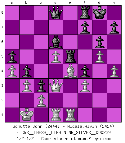 Last move : 1/2-1/2 2013 January 9 19:52:11 [Event "FICGS__CHESS__LIGHTNING_SILVER__000239"] [Site "FICGS"] [Date "2013.01.09"] [Round "1"] [White "Schutte,John"] [Black "Alcala,Alvin"] [Result "1/2-1/2"] [WhiteElo "2444"] [BlackElo "2424"] 1.e4 c5 2.Nf3 d6 3.d4 cxd4 4.Nxd4 Nf6 5.Nc3 a6 6.Be3 e5 7.Nb3 Be7 8.f3 Be6 9.Qd2 O-O 10.O-O-O Nbd7 11.g4 b5 12.a3 Nc5 13.Nxc5 dxc5 14.Nd5 Bxd5 15.exd5 Qd6 16.h4 c4 17.g5 Nh5 18.Bh3 a5 19.Bg4 b4 20.a4 Nf4 21.Bxf4 exf4 22.Qe2 c3 23.b3 Rae8 24.Rhe1 Qd8 25.Qd3 Bd6 26.Bf5 g6 27.Be4 Re5 28.Kb1 1/2-1/2 Sicilian : Najdorf, Byrne (English) attack Kingside Castling by player Black (move 9) Queenside Castling by player White (move 10) This chess game ended in a draw. Follow this game move after move (download)The Pawns are the soul of the game. (Francois Andre Danican Philidor) Zeige mir drei Eröffnungsvarianten und ich beweise dir, dass zwei davon inkorrekt sind. (Emanuel Lasker) El Ajedrez es despiadado: debes de estar preparado para matar gente. (Nigel Short) Il n'y a plus de joueurs du niveau de Jacob Murray dont la seule quête est le beau jeu, le plaisir de voir les pièces construire quelque chose. Sur 10 idées à la minute, 9 seront sans intérêt, la dernière s'avèrera géniale. (Christian Bauer) Hold em is to stud what chess is to checkers. (Johnny Moss)