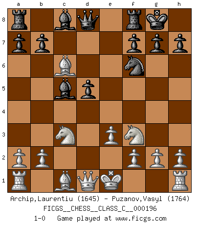 Last move : 1-0 2013 March 2 16:34:40 [Event "FICGS__CHESS__CLASS_C__000196"] [Site "FICGS"] [Date "2013.01.10"] [Round "1"] [White "Archip,Laurentiu"] [Black "Puzanov,Vasyl"] [Result "1-0"] [WhiteElo "1645"] [BlackElo "1764"] 1.c4 c5 2.Nc3 Nc6 3.Nf3 Nf6 4.e3 e6 5.d4 d5 6.cxd5 exd5 7.dxc5 Bxc5 8.Bb5 O-O 9.Bxc6 1-0 This chess game has been lost on time (started : 2013.01.10 4:38:15) English : Symmetrical, Four knights system Kingside Castling by player Black (move 8) Player White won this chess game. Follow this game move after move (download)My opponents make good moves too. Sometimes I don't take these things into consideration. (Bobby Fischer) Wie gewinnt Tal? Er entwickelt alle seine Figuren in die Brettmitte und opfert sie dann irgendwo. (Robert James Fischer) Tu sabes que vas a perder. Aún cuando tenía la ventaja, yo sabía que iba a perder. - al estar jugando con Fischer (Andrew Soltis) Je menace de comprendre la position. (Anonyme) Do you know these so called Volunteers don't even get paid! (Simpsons)