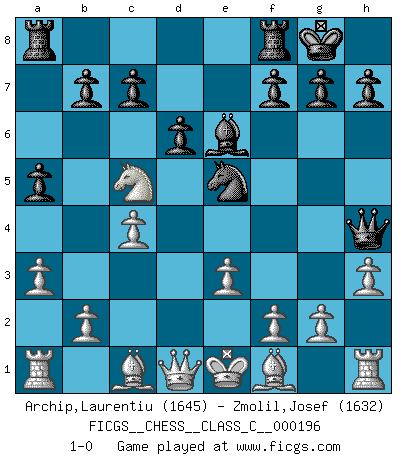Last move : 1-0 2013 May 26 11:41:50 [Event "FICGS__CHESS__CLASS_C__000196"] [Site "FICGS"] [Date "2013.01.10"] [Round "1"] [White "Archip,Laurentiu"] [Black "Zmolil,Josef"] [Result "1-0"] [WhiteElo "1645"] [BlackElo "1632"] 1.c4 e5 2.d4 Nf6 3.dxe5 Ng4 4.Nf3 Bc5 5.e3 Nc6 6.h3 Ngxe5 7.Nxe5 Nxe5 8.a3 a5 9.Qd5 d6 10.Nc3 O-O 11.Ne4 Be6 12.Qd1 Qh4 13.Nxc5 1-0 This chess game has been lost on time (started : 2013.01.10 4:38:15) English Opening Kingside Castling by player Black (move 10) Player White won this chess game. Follow this game move after move (download)You know, comrade Pachman, I don't enjoy being a Minister, I would rather play Chess like you. (Che Guevara) Ja, ich habe einmal eine Blitzpartie gespielt, es war in einem Zug, 1929. --im Interview 1989 (Mikhail Moiseyevich Botvinik) La estratégia requiere pensar, la táctica requiere observación. (Max Euwe) Echiquier : carré parfait, comme la Jérusalem nouvelle décrite par l'auteur de l'Apocalypse, huit cases sur huit, exaltation du chiffre 4, symbole du cosmos aux quatre horizons... où le noir et le blanc, l'ombre et la lumière, le mal et le bien s'entremêlent et se conjuguent. (Robert Couffignal, Le Gambit du poète) Pushing plastic is for the many, pushing virtual pieces is for the fewer, pushing wood is for the very few. (Normajean Yates)