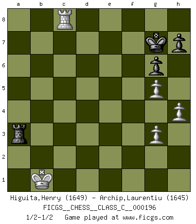 Last move : 1/2-1/2 2013 September 13 6:10:30 [Event "FICGS__CHESS__CLASS_C__000196"] [Site "FICGS"] [Date "2013.01.10"] [Round "1"] [White "Higuita,Henry"] [Black "Archip,Laurentiu"] [Result "1/2-1/2"] [WhiteElo "1649"] [BlackElo "1645"] 1.e4 d5 2.exd5 Qxd5 3.Nc3 Qd8 4.Nf3 Nf6 5.h3 e6 6.a3 Nc6 7.d4 a6 8.Bd3 Be7 9.O-O O-O 10.Ne2 b5 11.c3 Bb7 12.Qc2 g6 13.Ne5 Nxe5 14.dxe5 Nd7 15.Bf4 c5 16.Ng3 c4 17.Be4 Bxe4 18.Nxe4 Qc7 19.Bh6 Rfd8 20.f4 Nc5 21.Nxc5 Qxc5+ 22.Kh1 Rd3 23.Rad1 Rad8 24.Kh2 Qe3 25.Qc1 Qg3+ 26.Kh1 Qh4 27.Bg5 Bxg5 28.fxg5 Qe4 29.Kg1 Qxe5 30.Rde1 Qc5+ 31.Kh1 Qc6 32.Kg1 Rg3 33.Rf2 R8d3 34.Qf4 Qb7 35.Ref1 Qe7 36.h4 e5 37.Qxf7+ Qxf7 38.Rxf7 Rd8 39.Kh2 Rg4 40.Kh3 Re4 41.Ra7 Rd3+ 42.g3 R4e3 43.Rg1 Rd6 44.Rg2 e4 45.Re7 a5 46.Kg4 Re1 47.Re5 Rb6 48.Kf4 b4 49.Rxa5 bxc3 50.bxc3 Rb3 51.Rc2 e3 52.Kf3 Rd1 53.Kxe3 Rd3+ 54.Kf2 Rbxc3 55.Rxc3 Rxc3 56.a4 Ra3 57.Ra8+ Kg7 58.a5 c3 59.Rc8 Ra2+ 60.Ke1 c2 61.Kd2 Rxa5 62.Kxc2 Ra2+ 63.Kb1 Ra3 64.Rc7+ Kg8 65.Rc8+ Kg7 66.Rc7+ Kg8 67.Rc8+ Kg7 1/2-1/2 Scandinavian (centre counter) defense Kingside Castling by player White (move 9) Kingside Castling by player Black (move 9) 10 pieces endgame at move 61 : White KRPPP , Black KRPPP WHITE : King + 1 Rook 3 Pawns BLACK : King + 1 Rook 3 Pawns 9 pieces endgame at move 62 : White KRPPP , Black KRPP WHITE : King + 1 Rook 3 Pawns BLACK : King + 1 Rook 2 Pawns This chess game ended in a draw. Follow this game move after move (download)For me, Chess is life and every game is like a new life. Every Chess player gets to live many lives in one lifetime. (Eduard Gufeld) Das Blackmar-Diemer-Gambit verändert den ganzen Menschen! (Emil Joseph Diemer) El Ajedrez es un juego terrible. Si no dominas el centro, tu oponente tiene una posición mas libre. Si tu tienes el centro, entonces realmente tienes algo de que preocuparte. (Siegbert Tarrasch) Le plus grand jeu de l'esprit jamais inventé, plus vous l'apprenez, plus vous y prenez du plaisir. (Garry Kasparov) I don't believe in psychology. I believe in good moves. (Bobby Fischer)