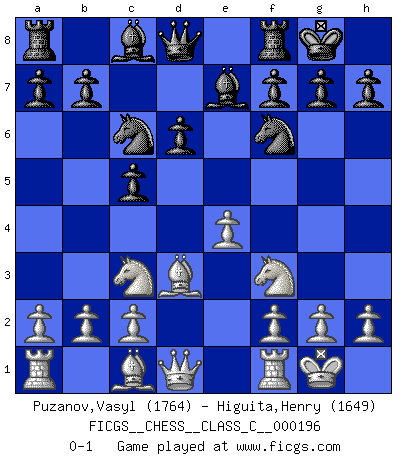 Last move : 0-1 2013 March 3 23:58:16 [Event "FICGS__CHESS__CLASS_C__000196"] [Site "FICGS"] [Date "2013.01.10"] [Round "1"] [White "Puzanov,Vasyl"] [Black "Higuita,Henry"] [Result "0-1"] [WhiteElo "1764"] [BlackElo "1649"] 1.e4 e5 2.Nf3 d6 3.d4 exd4 4.Nxd4 Be7 5.Nc3 Nf6 6.Bd3 O-O 7.O-O c5 8.Nf3 Nc6 0-1 This chess game has been lost on time (started : 2013.01.10 4:38:15) Philidor : Exchange variation Kingside Castling by player Black (move 6) Kingside Castling by player White (move 7) Player Black won this chess game. Follow this game move after move (download)Chess problems demand from the composer the same virtues that characterize all worthwhile art: originality, invention, conciseness, harmony, complexity, and splendid insincerity. (Vladimir Nabokov) Ich habe Putins Aufstieg an die Macht beobachtet und seine Politik, die demokratischen Institutionen meines Landes zu zerstören. (Garry Kasparov) De eso se trata el Ajedrez. Un día le das una lección a tu oponente y al día siguiente el te da una a tí. (Bobby Fischer) Lorsque vous vous retrouvez devant une position atroce, ne tendez pas un ultime piège dérisoire avec l'intention d'abandonner si l'adversaire le déjoue ! Faites-vous plutôt un devoir de résister comme si votre vie en dépendait. Jouez le coup qui vous déplairait au centuple si vous étiez dans la peau de votre tortionnaire ! It's not a bug - it's an undocumented feature. (Anonymous)