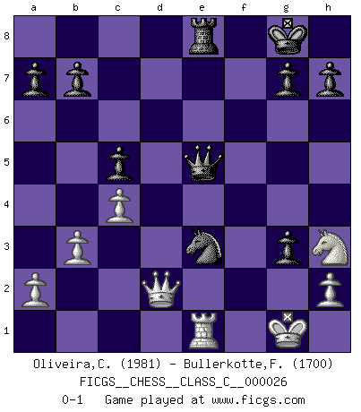 Last move : 0-1 2007 April 13 19:1:3 [Event "FICGS__CHESS__CLASS_C__000026"] [Site "FICGS"] [Date "2007.01.24"] [Round "1"] [White "Oliveira,Carlos"] [Black "Bullerkotte,Frank"] [Result "0-1"] [WhiteElo "1981"] [BlackElo "1700"] 1.b3 Nf6 2.Bb2 e6 3.e3 d5 4.f4 c5 5.Nf3 Be7 6.Bb5+ Bd7 7.Bxd7+ Nbxd7 8.O-O Qc7 9.d3 O-O 10.Qe2 Bd6 11.c4 e5 12.fxe5 Nxe5 13.Nxe5 Bxe5 14.Bxe5 Qxe5 15.Nd2 Rfe8 16.Rfe1 Rad8 17.Nf3 Qd6 18.Qc2 Ng4 19.Qc1 dxc4 20.dxc4 f5 21.Qc3 Qe7 22.Rad1 Rxd1 23.Rxd1 Nxe3 24.Re1 Qe4 25.Qd2 f4 26.Ng5 Qe7 27.Nh3 Qe5 28.g3 fxg3 0-1 Nimzovich-Larsen attack : Indian variation Kingside Castling by player White (move 8) Kingside Castling by player Black (move 9) Player Black won this chess game. Follow this game move after move (download)It is difficult to play against Einstein's theory --on his first loss to Fischer. (Mikhail Tal) Ich hatte meine größten Erfolge, als ich 47 Jahre alt war. Kasparow war noch nicht mal 42 und hat das Schach schon im Stich gelassen. (Viktor Kortschnoi) El Ajedrez detiene a su maestro dentro de sus propios vínculos, encadenando la mente y el cerebro, por lo que la libertad interior del mas fuerte debe sufrir. (Albert Einstein) Ce qui caractérise les parties de combat, c'est que si le défenseur a constamment de difficiles problèmes à résoudre, l'attaquant doit chercher sans relâche de nouvelles possibilités d'attaque. (Koblentz) Employ the attack like tactic of defense. (Chinese proverb)