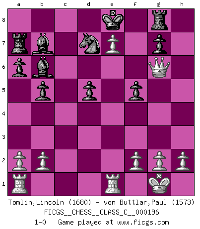 Last move : 1-0 2013 February 19 16:41:50 [Event "FICGS__CHESS__CLASS_C__000196"] [Site "FICGS"] [Date "2013.01.10"] [Round "1"] [White "Tomlin,Lincoln"] [Black "von Buttlar,Paul"] [Result "1-0"] [WhiteElo "1680"] [BlackElo "1573"] 1.c4 e6 2.Nc3 c6 3.d4 d5 4.e3 Nf6 5.Bd3 dxc4 6.Bxc4 Nbd7 7.Nf3 b5 8.Be2 a6 9.e4 c5 10.e5 cxd4 11.Qxd4 Bc5 12.Qh4 Nd5 13.Qg3 Rg8 14.Nxd5 exd5 15.O-O Bb7 16.Bd2 Qe7 17.Rfe1 Bb6 18.Bg5 Qe6 19.Nh4 h6 20.Bg4 hxg5 21.Bxe6 fxe6 22.Qxg5 Nf8 23.Nf5 exf5 24.e6 Ra7 25.e7 Nd7 26.Qg6+ 1-0 English Opening Kingside Castling by player White (move 15) Player White won this chess game. Follow this game move after move (download)Chess is not like life... it has rules ! (Mark Pasternak) Capablanka war das größte Genie der Schachgeschichte! Aber denken sie nicht er habe nichts vom Schach verstanden. Er wusste nur soviel wie er wissen musste um seine Ziele zu erreichen. (Mikhail Moiseyevich Botvinik) Del Ajedrez se ha dicho que la vida no es lo suficientemente larga para él, pero eso es culpa de la vida, no del Ajedrez. (William Ewart Napier) L'ordinateur a tué l'originalité. Il n'y a plus guère d'aventures sur l'échiquier. (Jacob Murray) The general who wins the battle makes many calculations in his temple before the battle is fought. The general who loses makes but few calculations beforehand. (Sun Tzu)